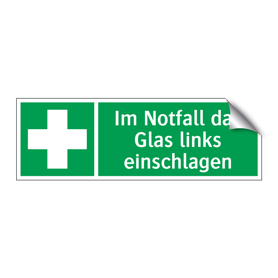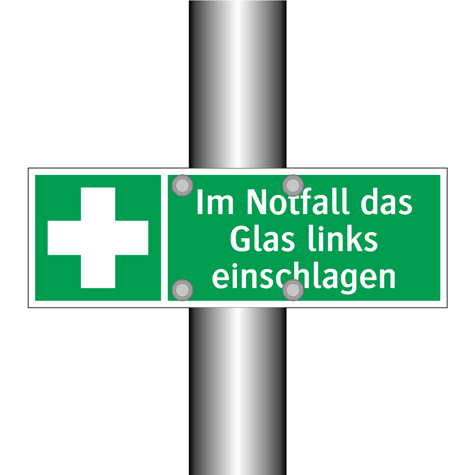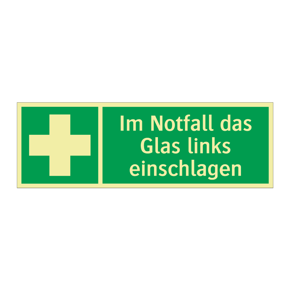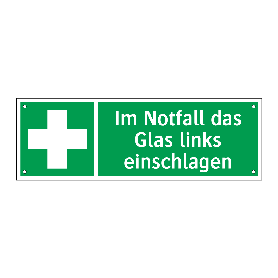 Rettungsschild mit dem Text Im Notfall das Glas links einschlagen