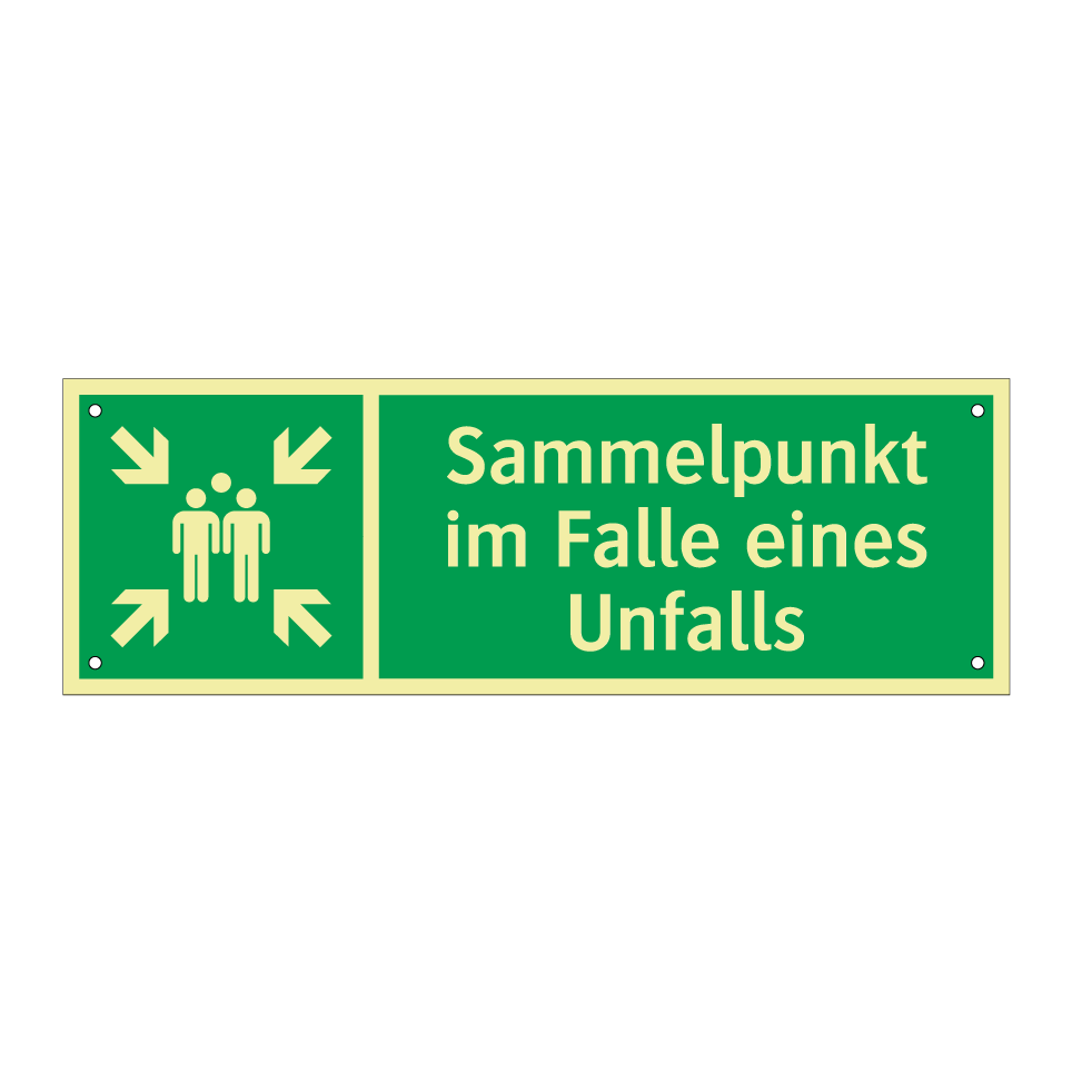 Rettungsschild mit dem Text Sammelpunkt im Falle eines Unfalls