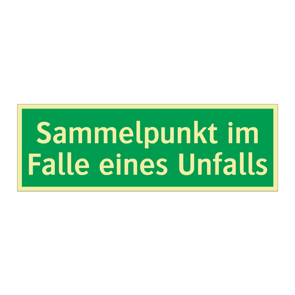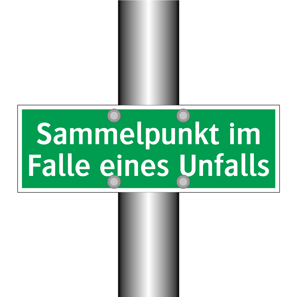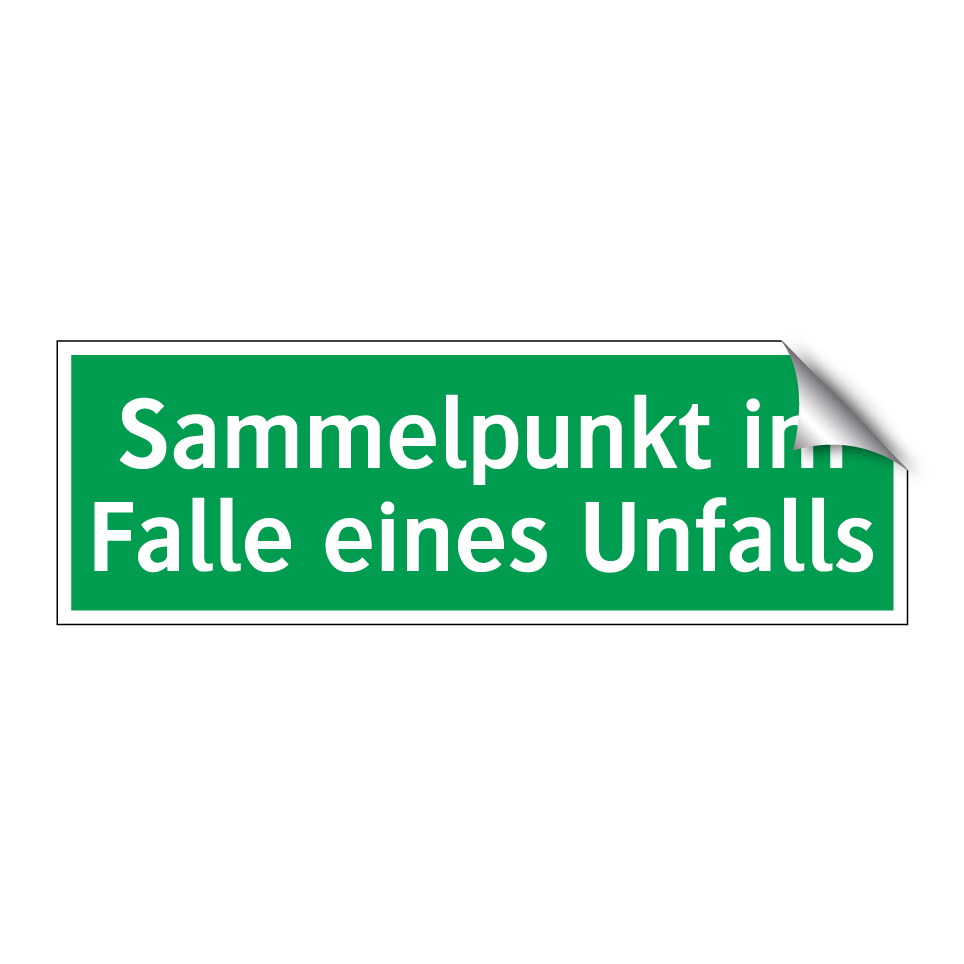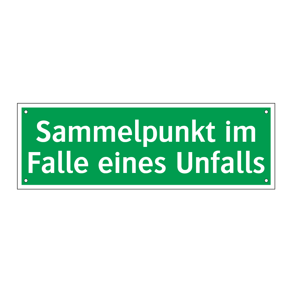 Rettungsschild mit dem Text Sammelpunkt im Falle eines Unfalls