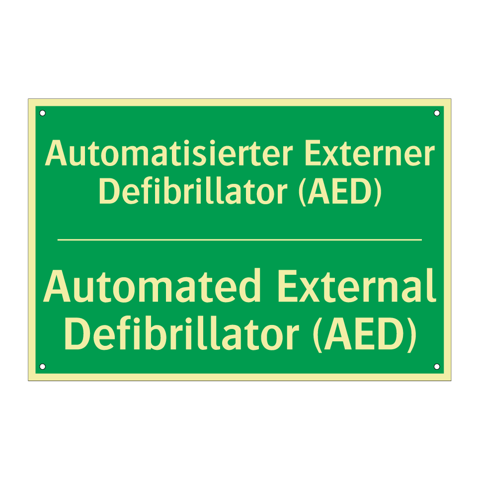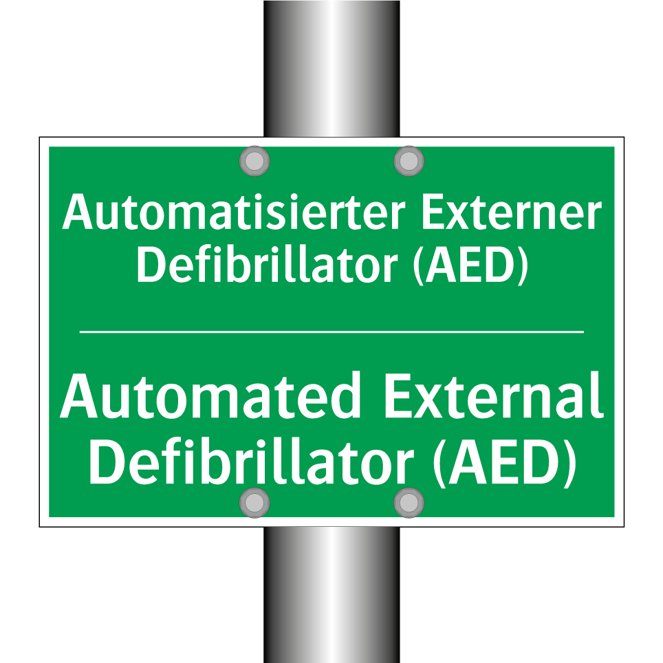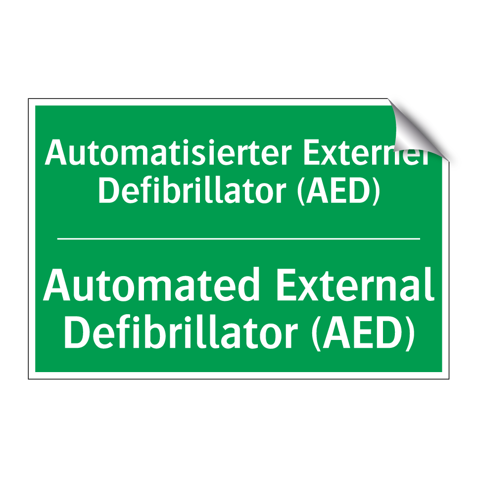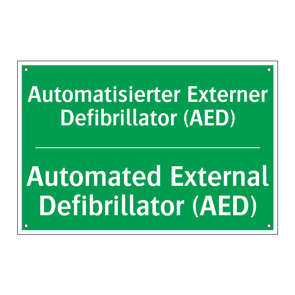 Zweisprachiges Rettungsschild mit deutschem Text Automatisierter Externer Defibrillator (AED) und englischem Text Automated External Defibrillator (AED)