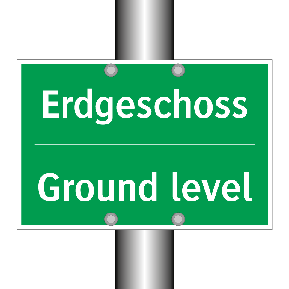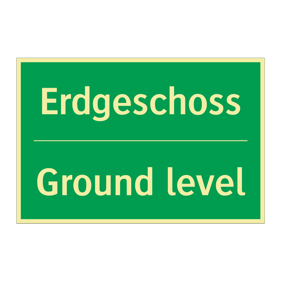 Zweisprachiges Rettungsschild mit deutschem Text Erdgeschoss und englischem Text Ground level
