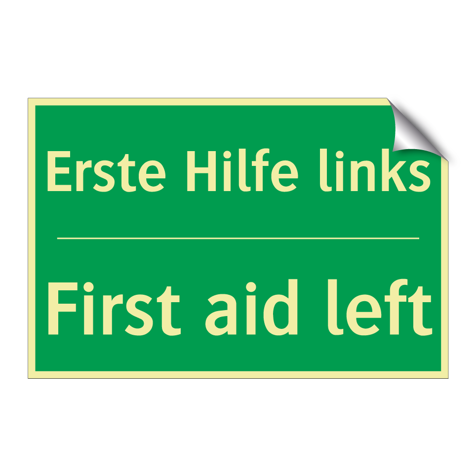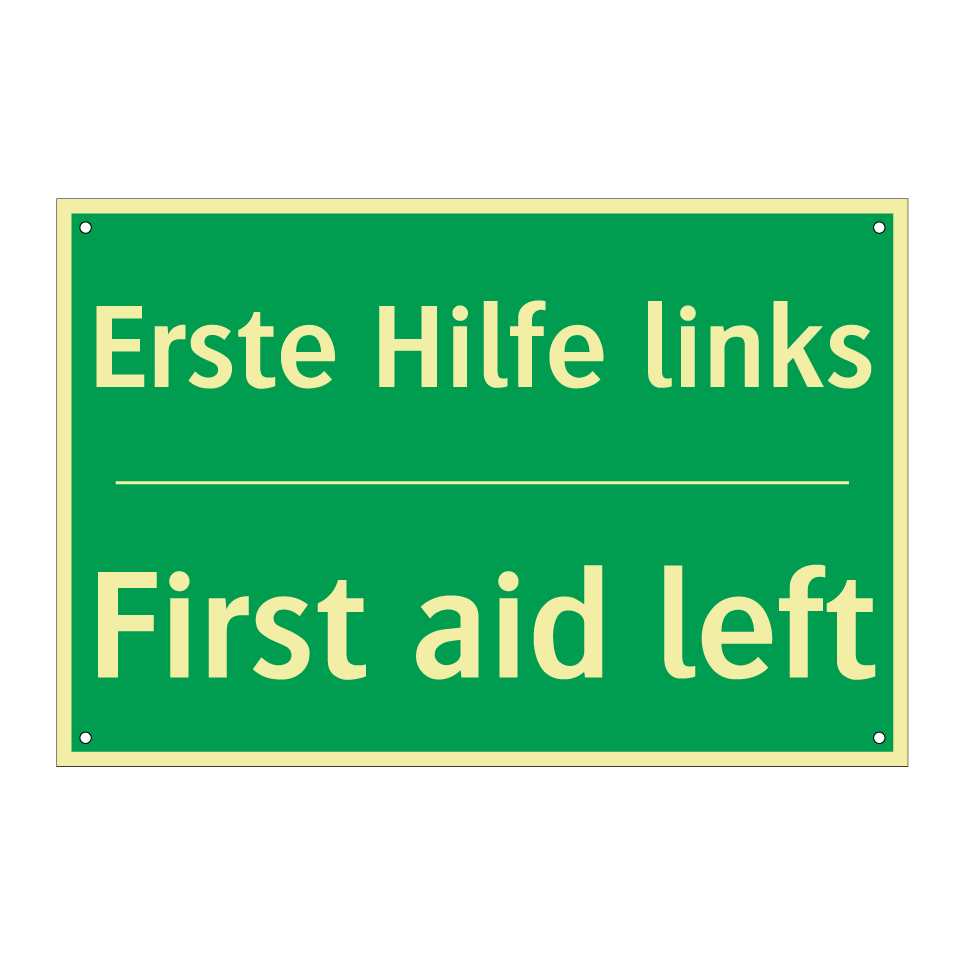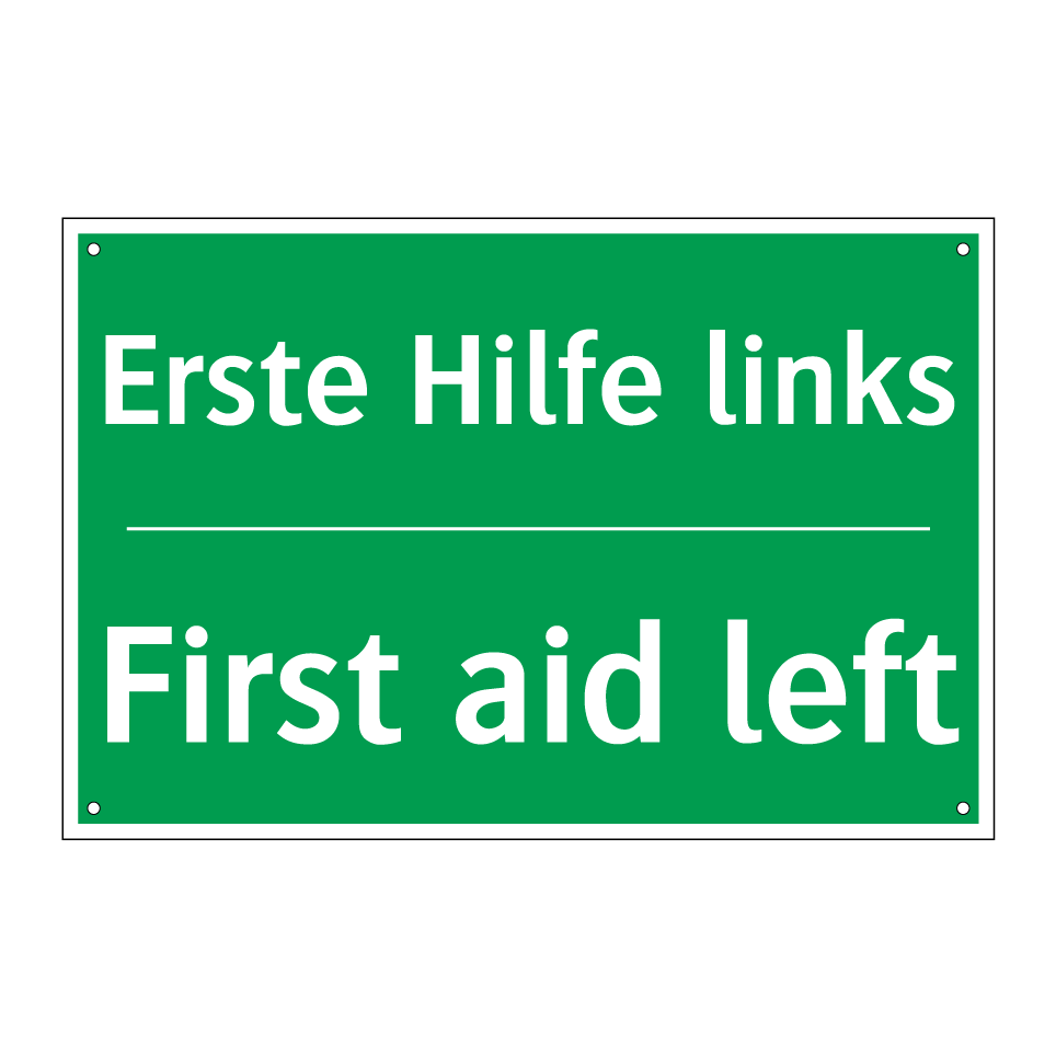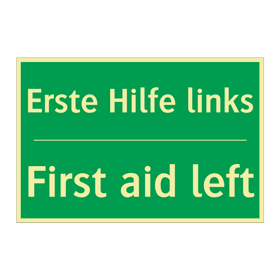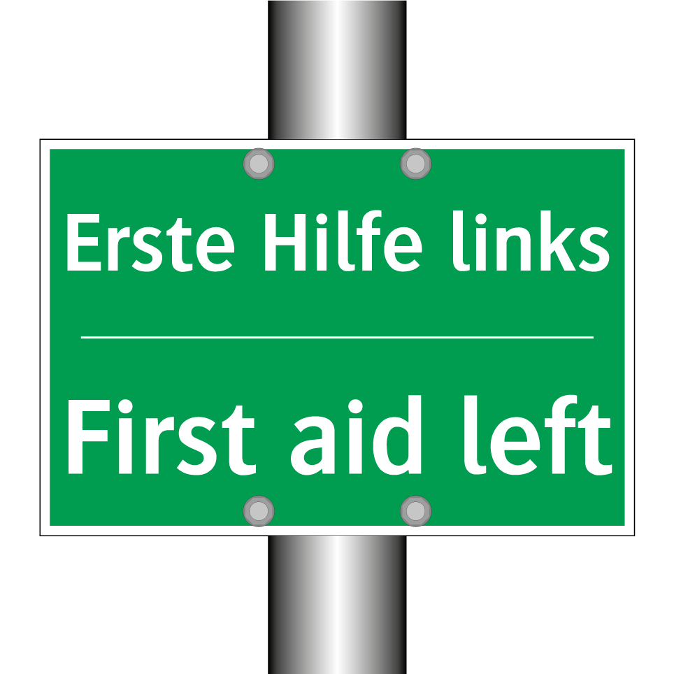 Zweisprachiges Rettungsschild mit deutschem Text Erste Hilfe links und englischem Text First aid left