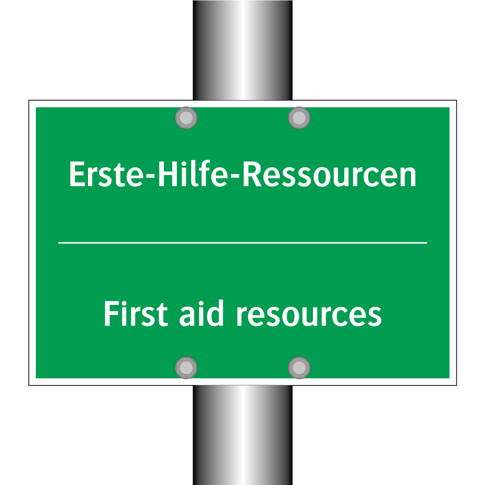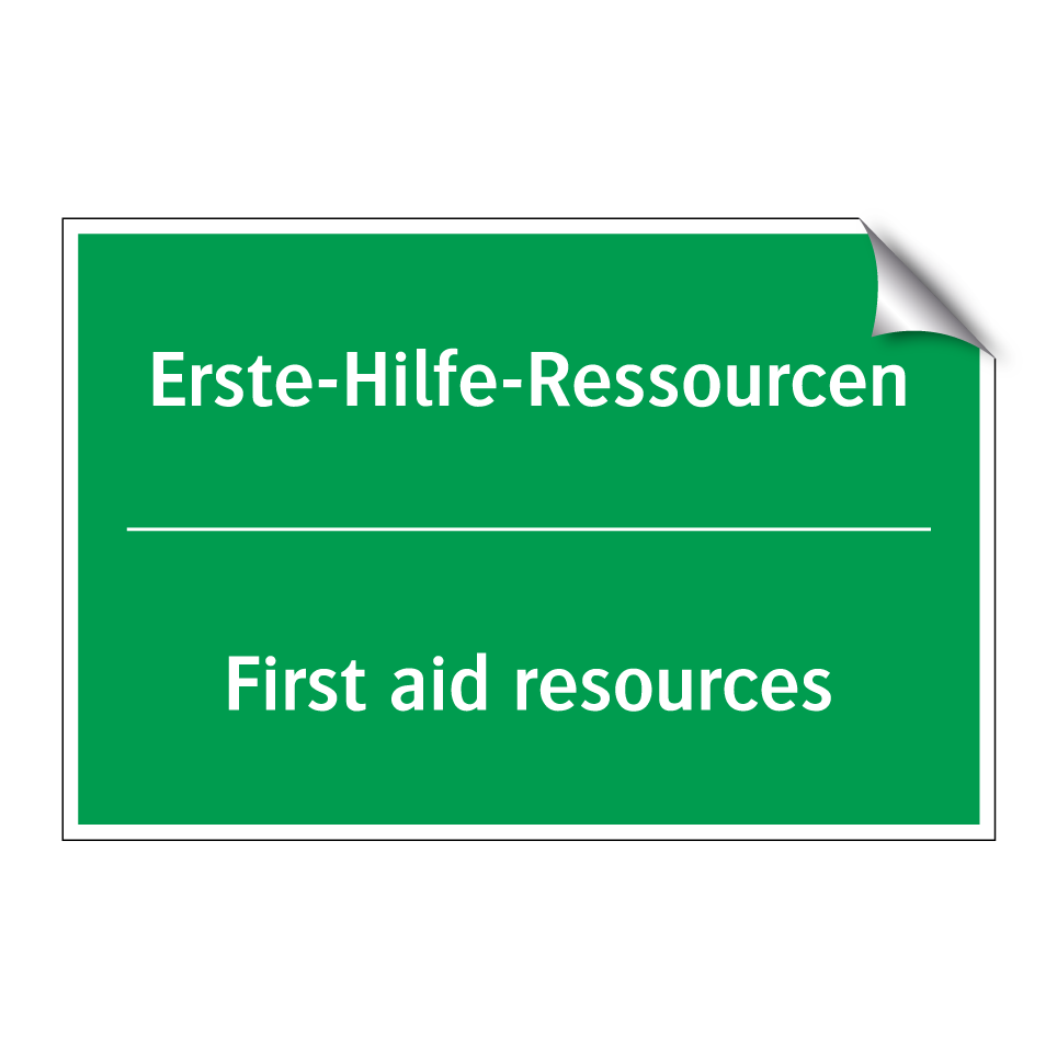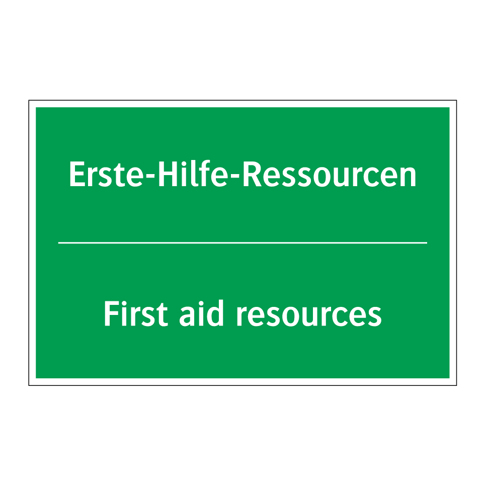 Zweisprachiges Rettungsschild mit deutschem Text Erste-Hilfe-Ressourcen und englischem Text First aid resources
