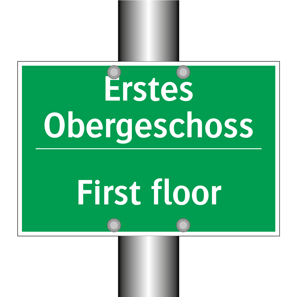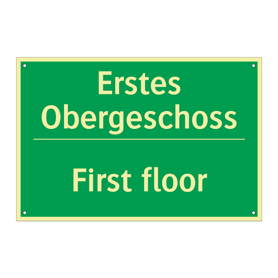 Zweisprachiges Rettungsschild mit deutschem Text Erstes Obergeschoss und englischem Text First floor