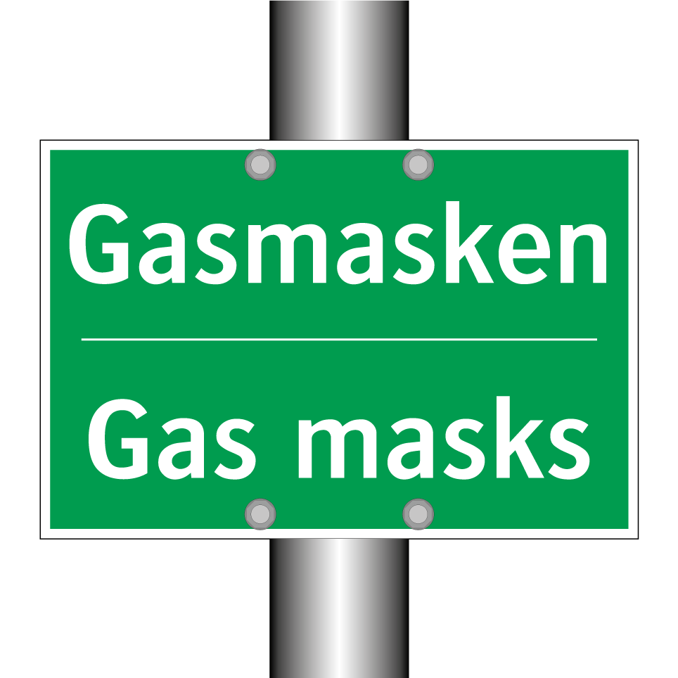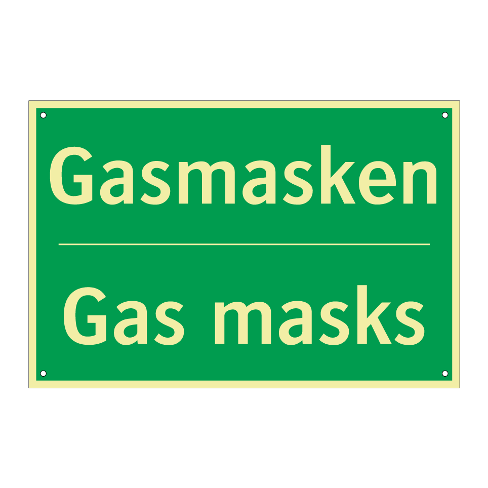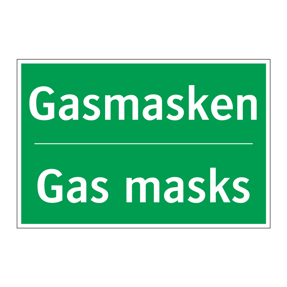 Zweisprachiges Rettungsschild mit deutschem Text Gasmasken und englischem Text Gas masks