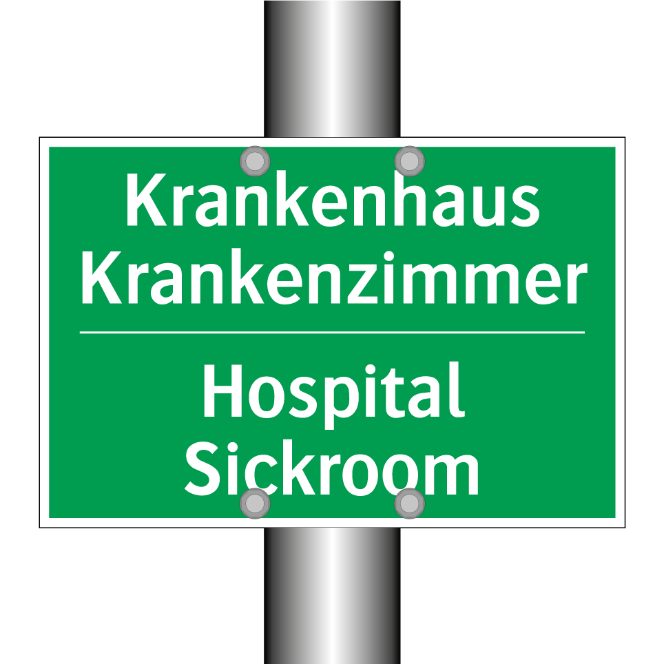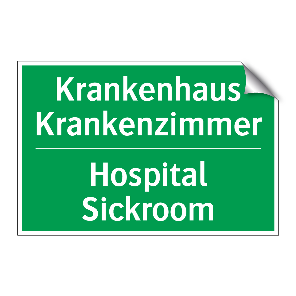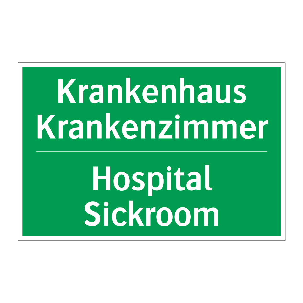 Zweisprachiges Rettungsschild mit deutschem Text Krankenhaus Krankenzimmer und englischem Text Hospital Sickroom