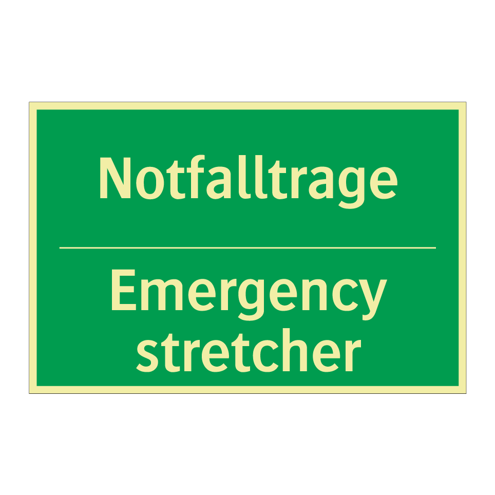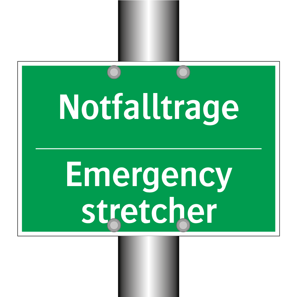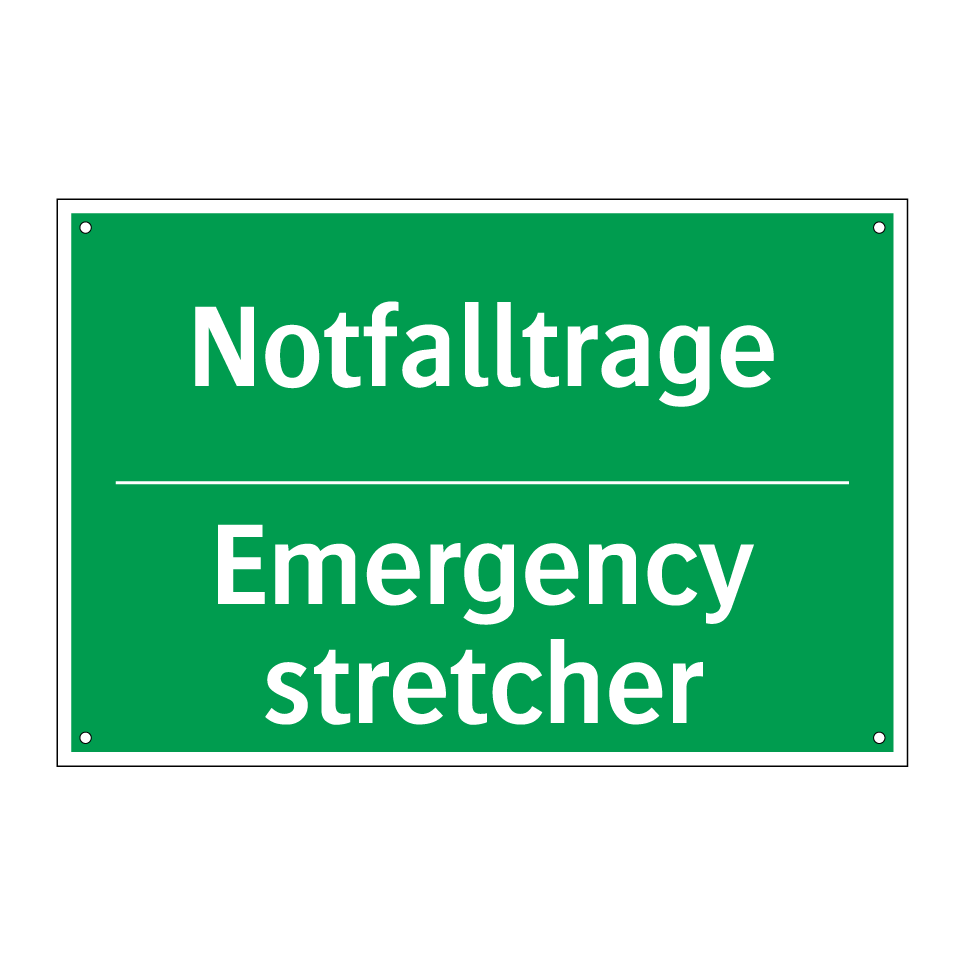 Zweisprachiges Rettungsschild mit deutschem Text Notfalltrage und englischem Text Emergency stretcher