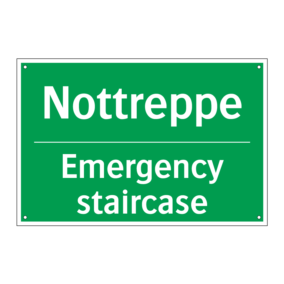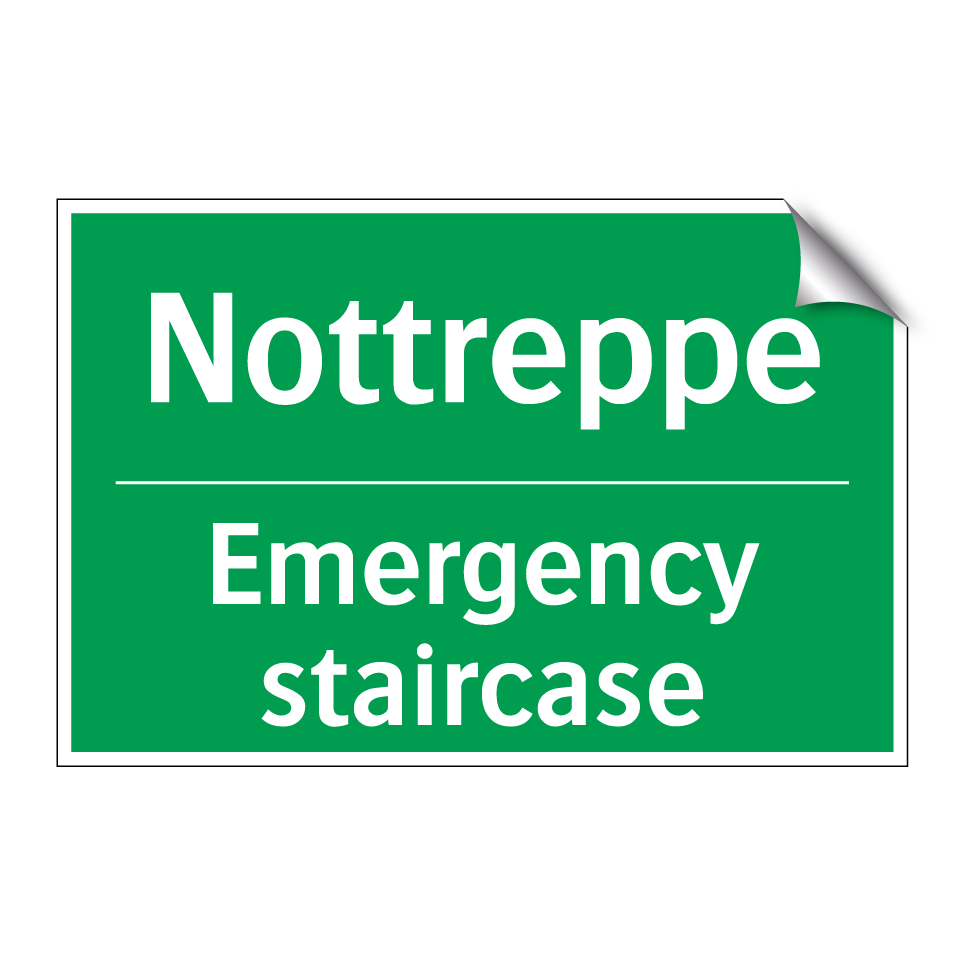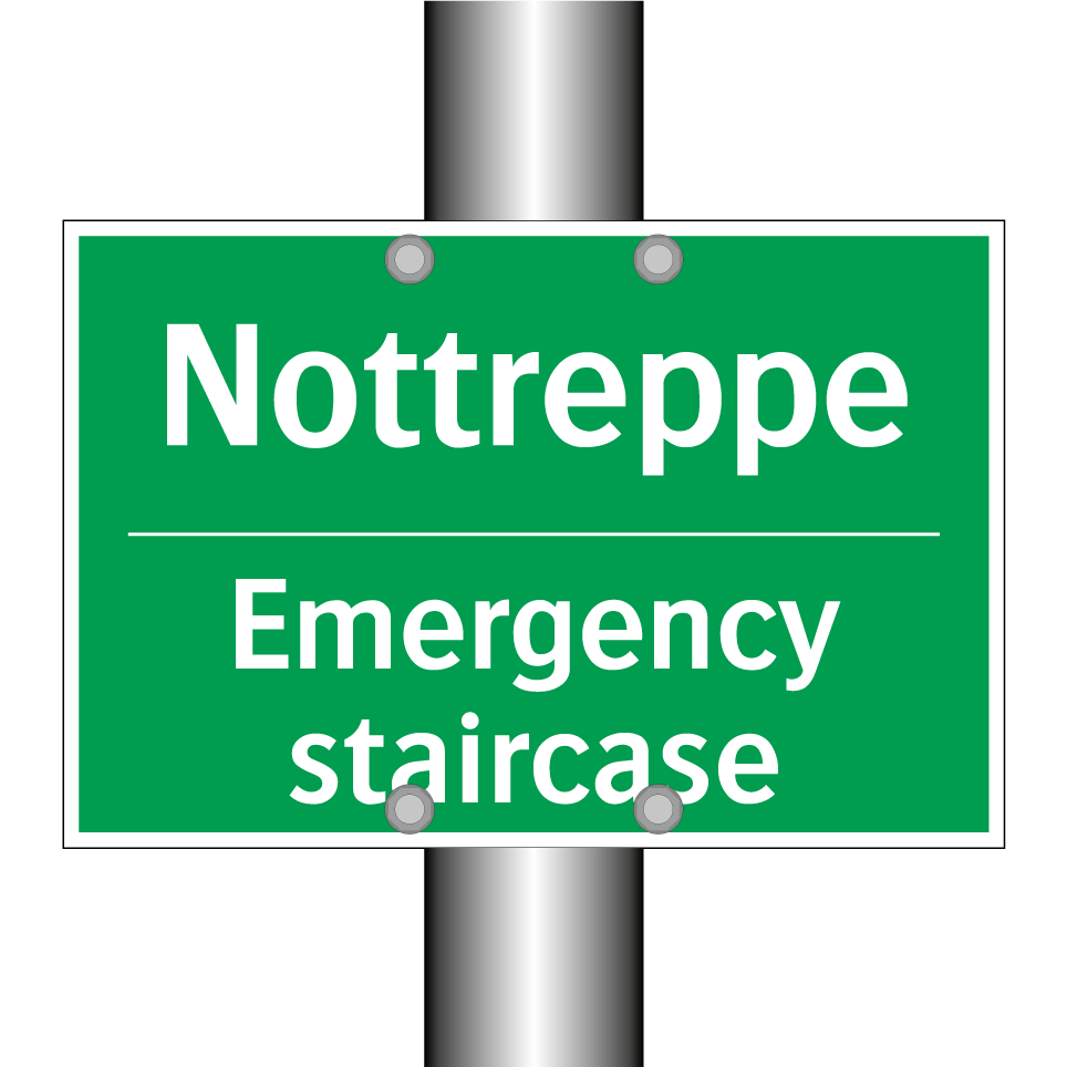 Zweisprachiges Rettungsschild mit deutschem Text Nottreppe und englischem Text Emergency staircase