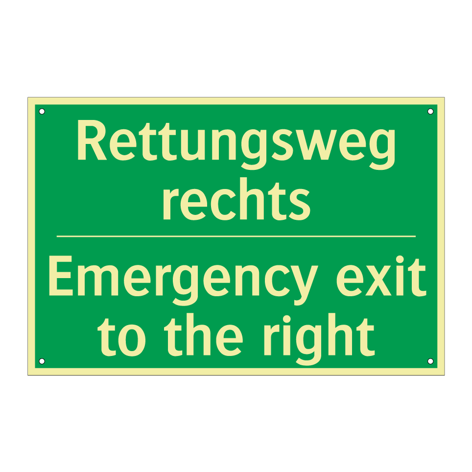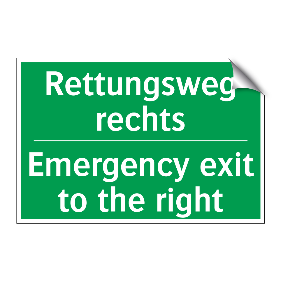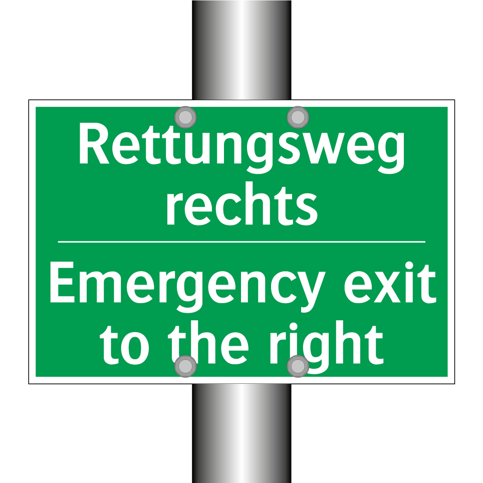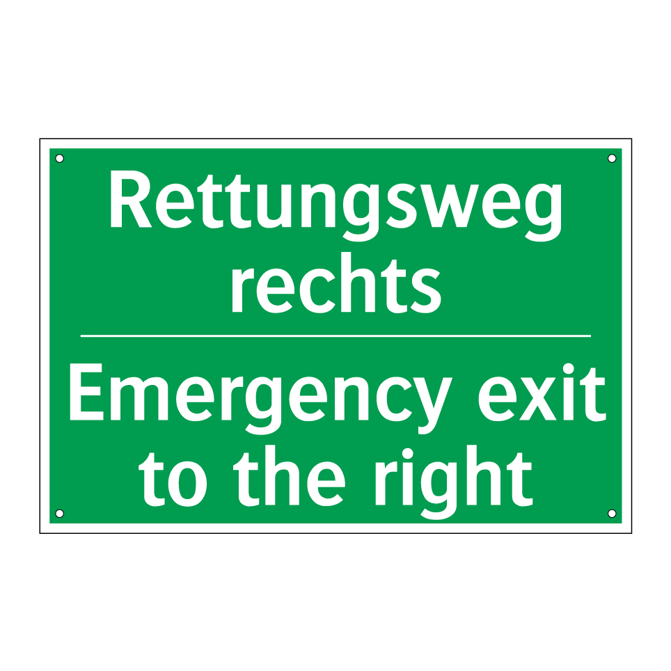 Zweisprachiges Rettungsschild mit deutschem Text Rettungsweg rechts und englischem Text Emergency exit to the right
