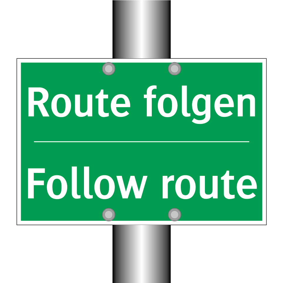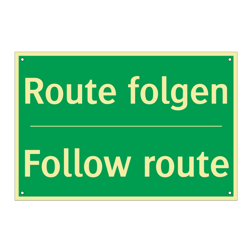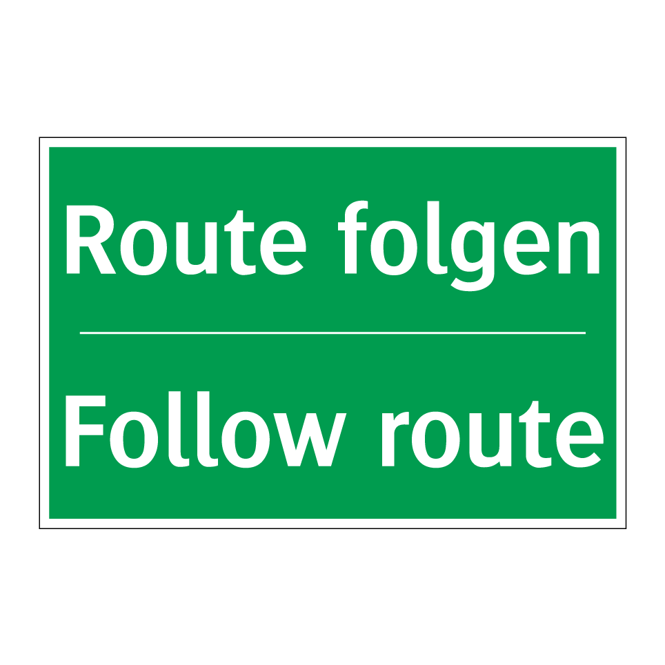 Zweisprachiges Rettungsschild mit deutschem Text Route folgen und englischem Text Follow route