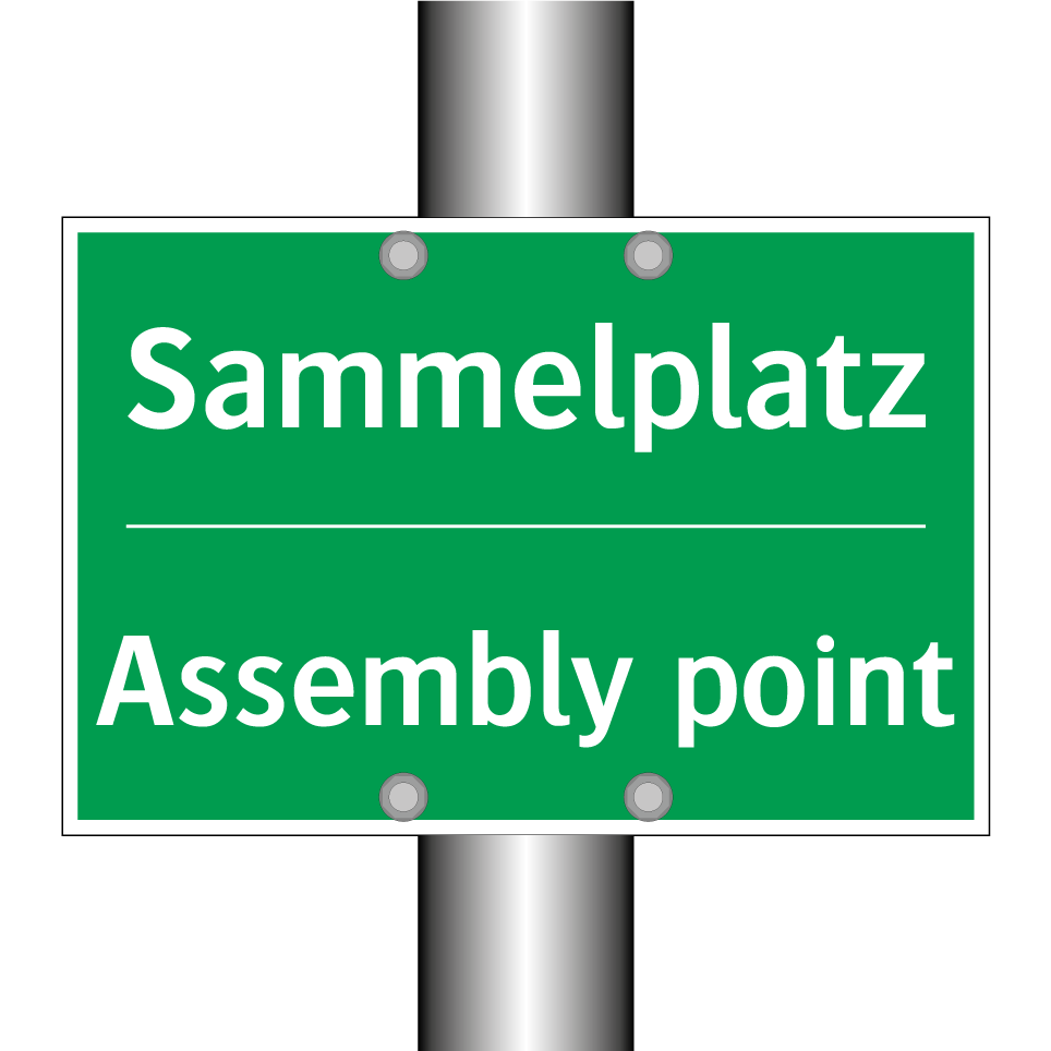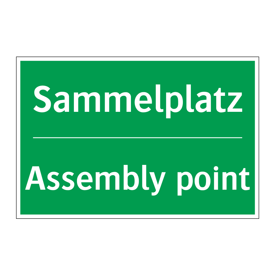 Zweisprachiges Rettungsschild mit deutschem Text Sammelplatz und englischem Text Assembly point