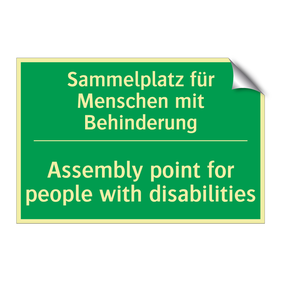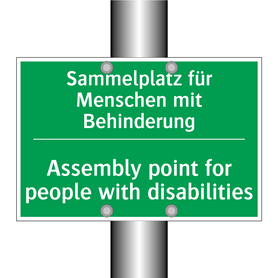 Zweisprachiges Rettungsschild mit deutschem Text Sammelplatz für Menschen mit Behinderung und englischem Text Assembly point for people with disabilities