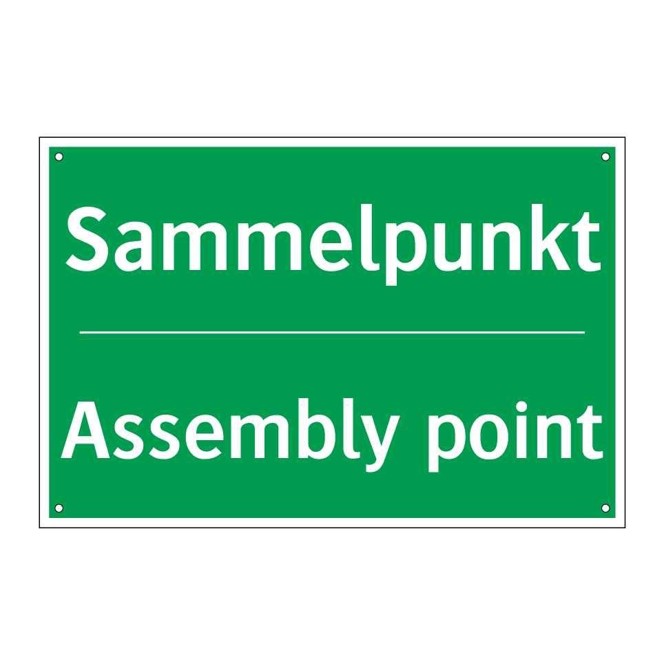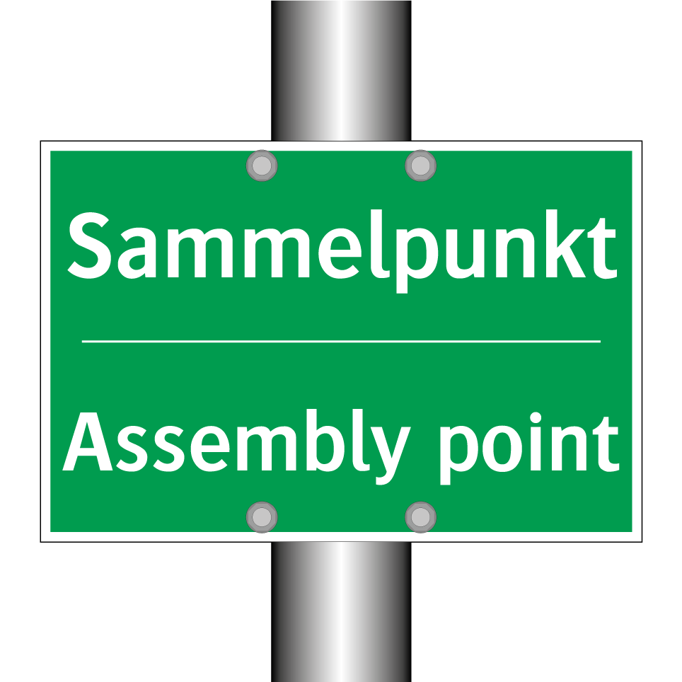 Zweisprachiges Rettungsschild mit deutschem Text Sammelpunkt und englischem Text Assembly point