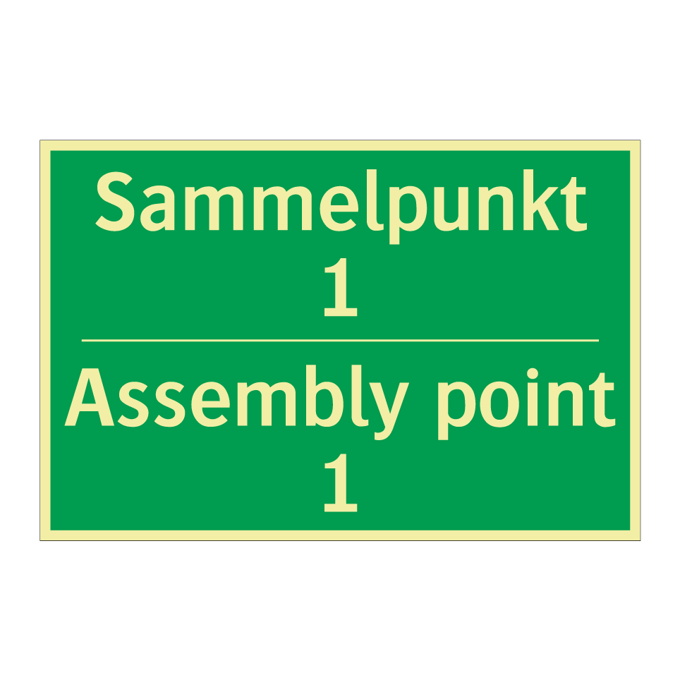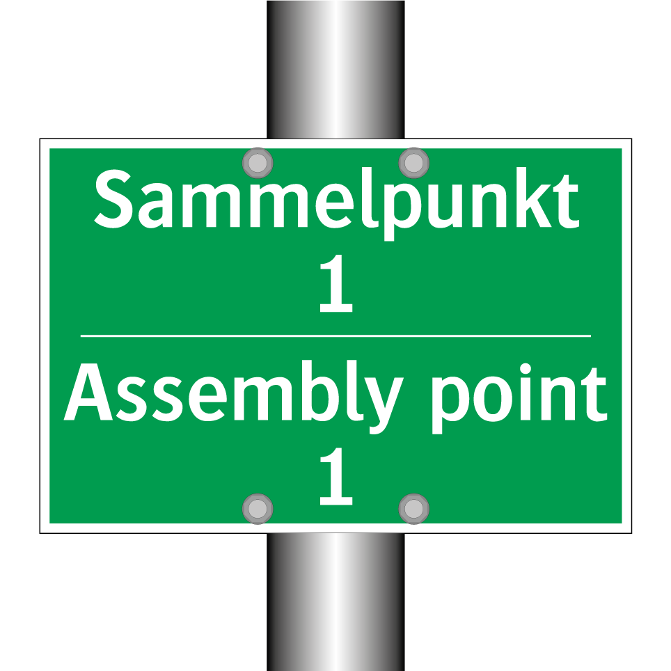 Zweisprachiges Rettungsschild mit deutschem Text Sammelpunkt 1 und englischem Text Assembly point 1