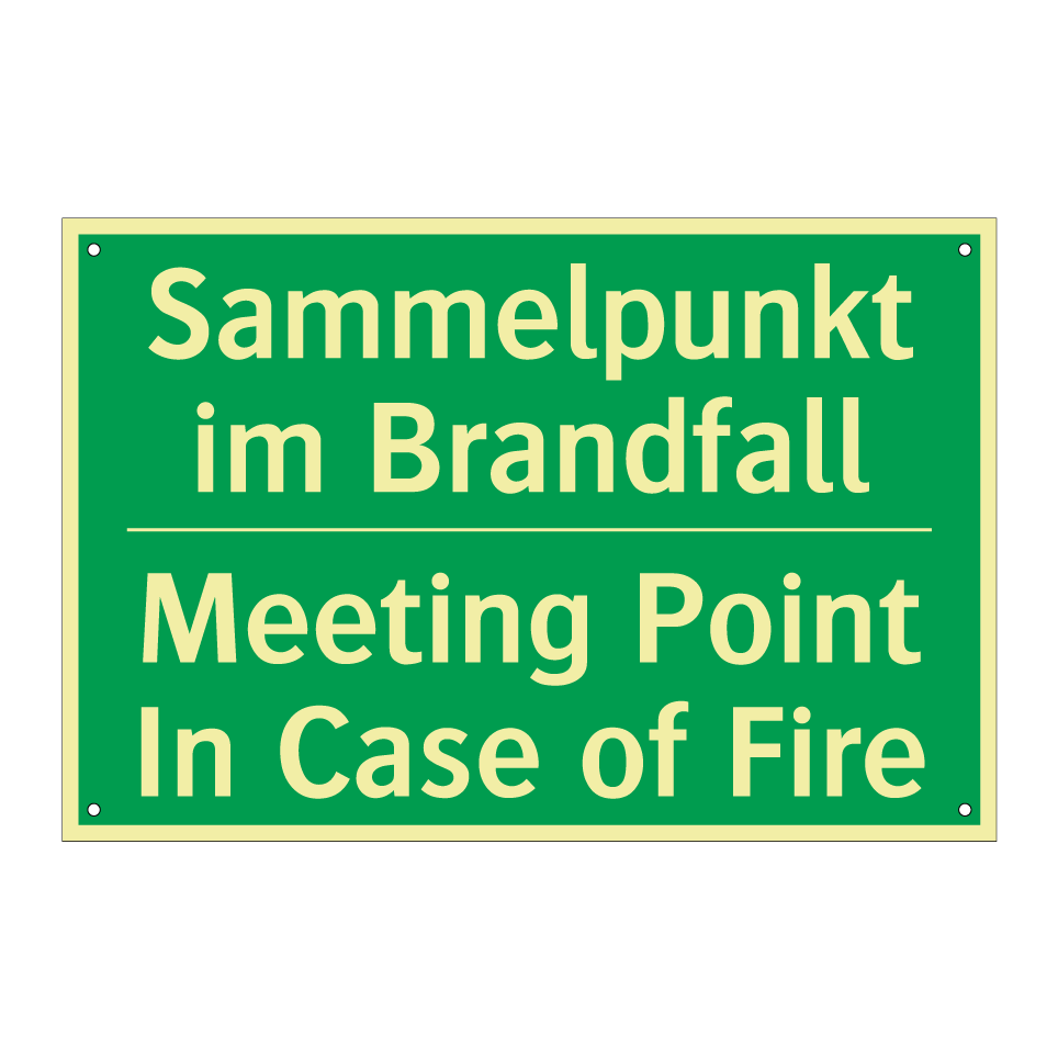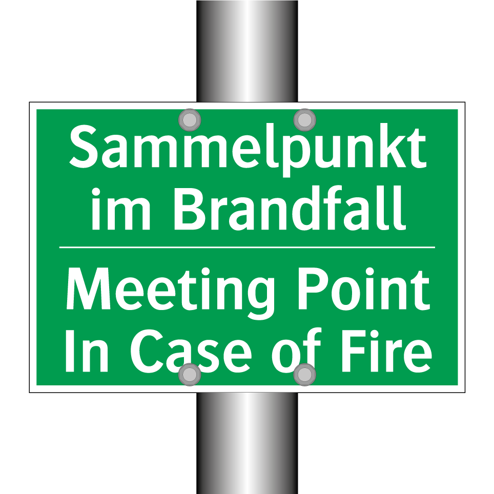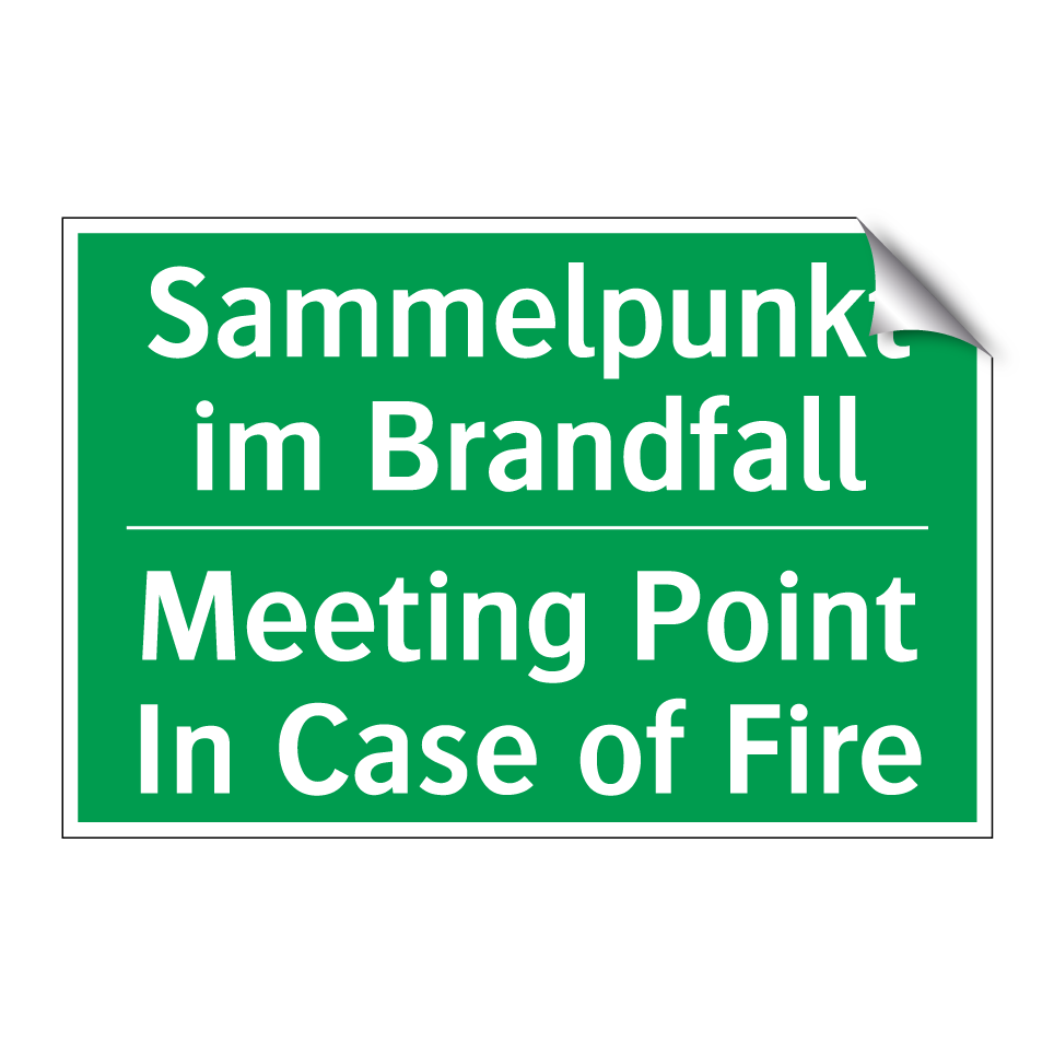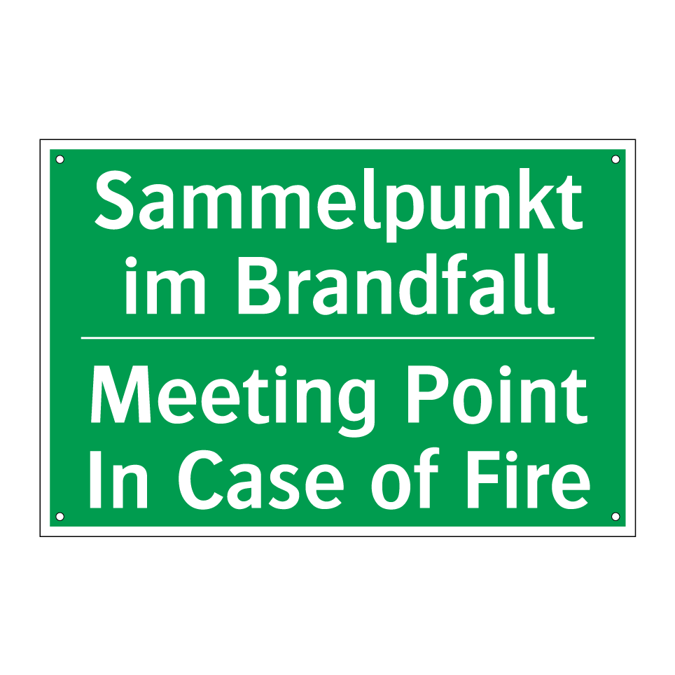 Zweisprachiges Rettungsschild mit deutschem Text Sammelpunkt im Brandfall und englischem Text Meeting Point In Case of Fire