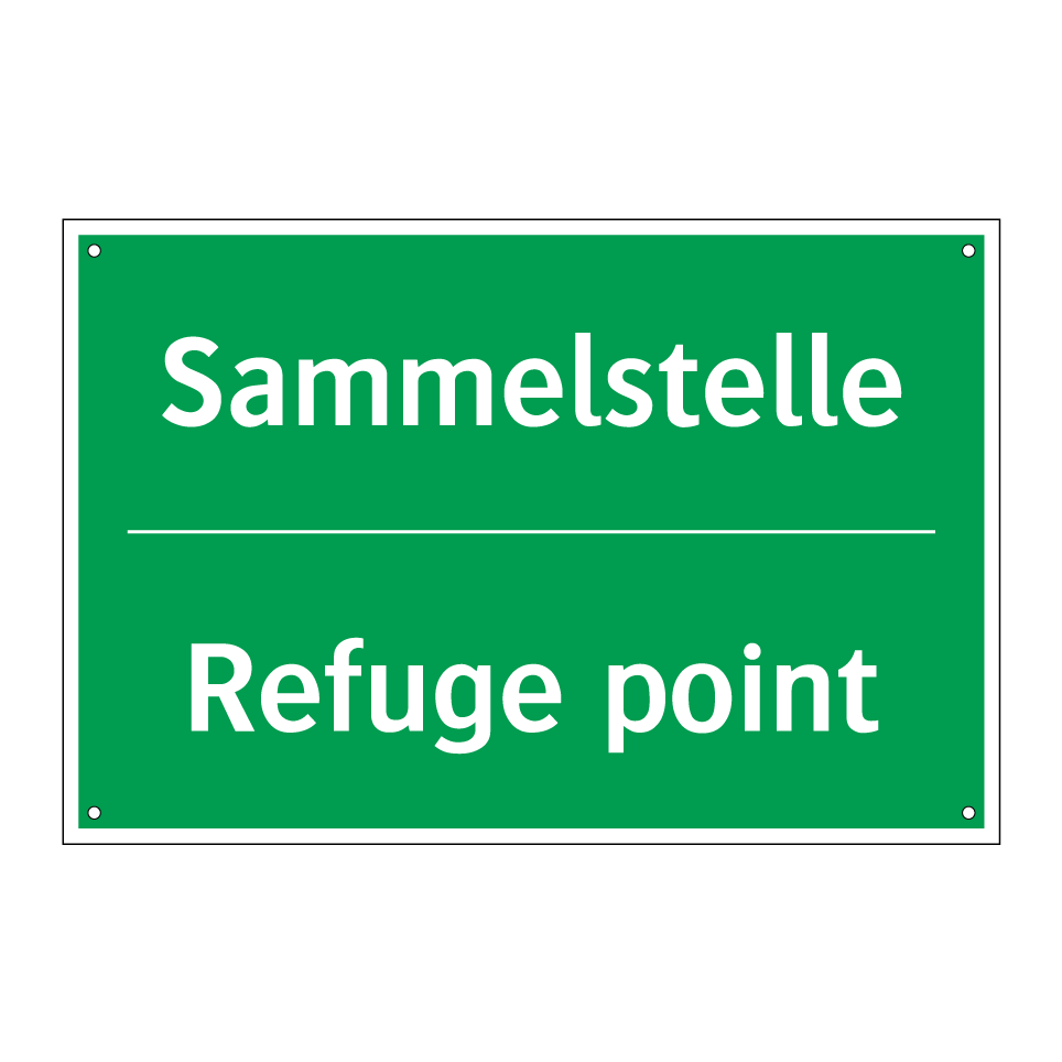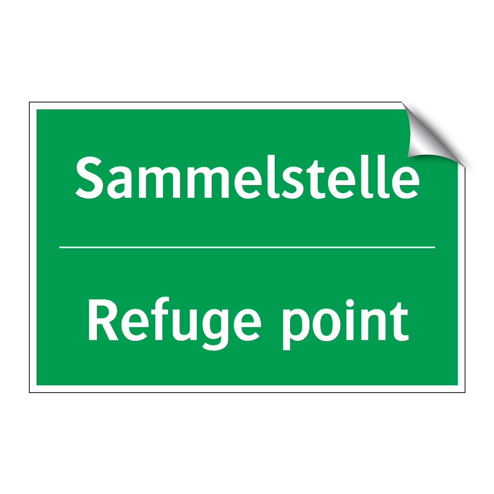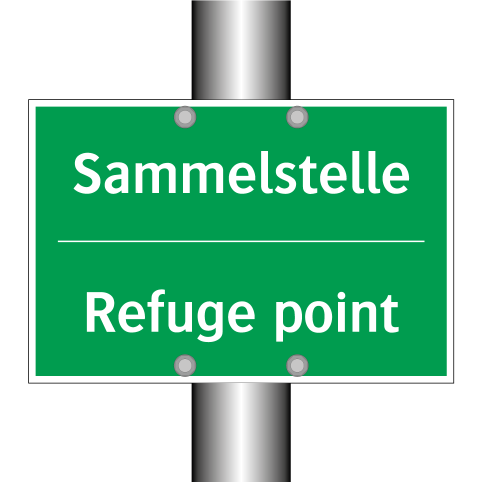 Zweisprachiges Rettungsschild mit deutschem Text Sammelstelle und englischem Text Refuge point