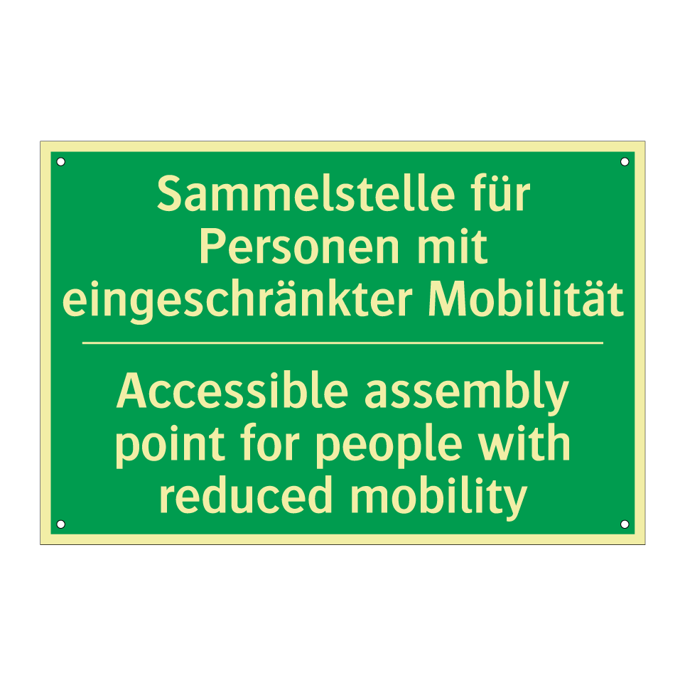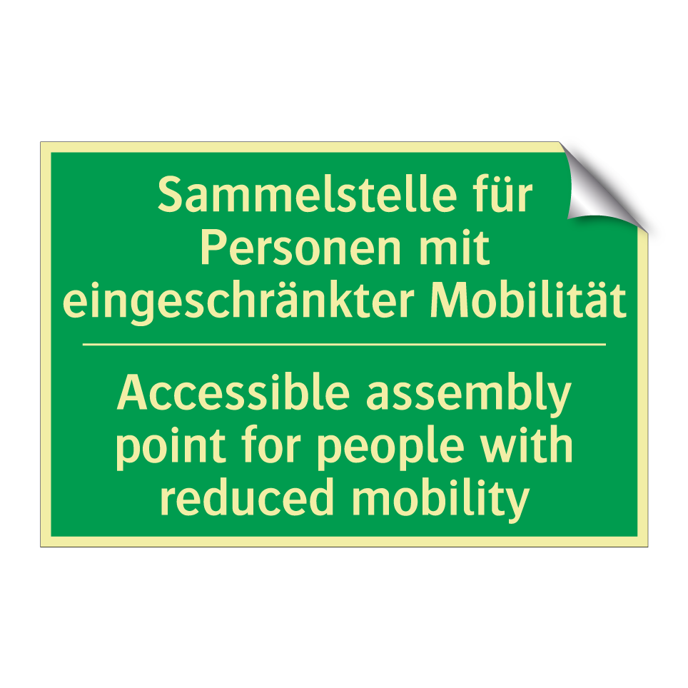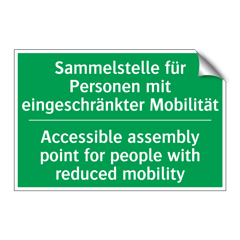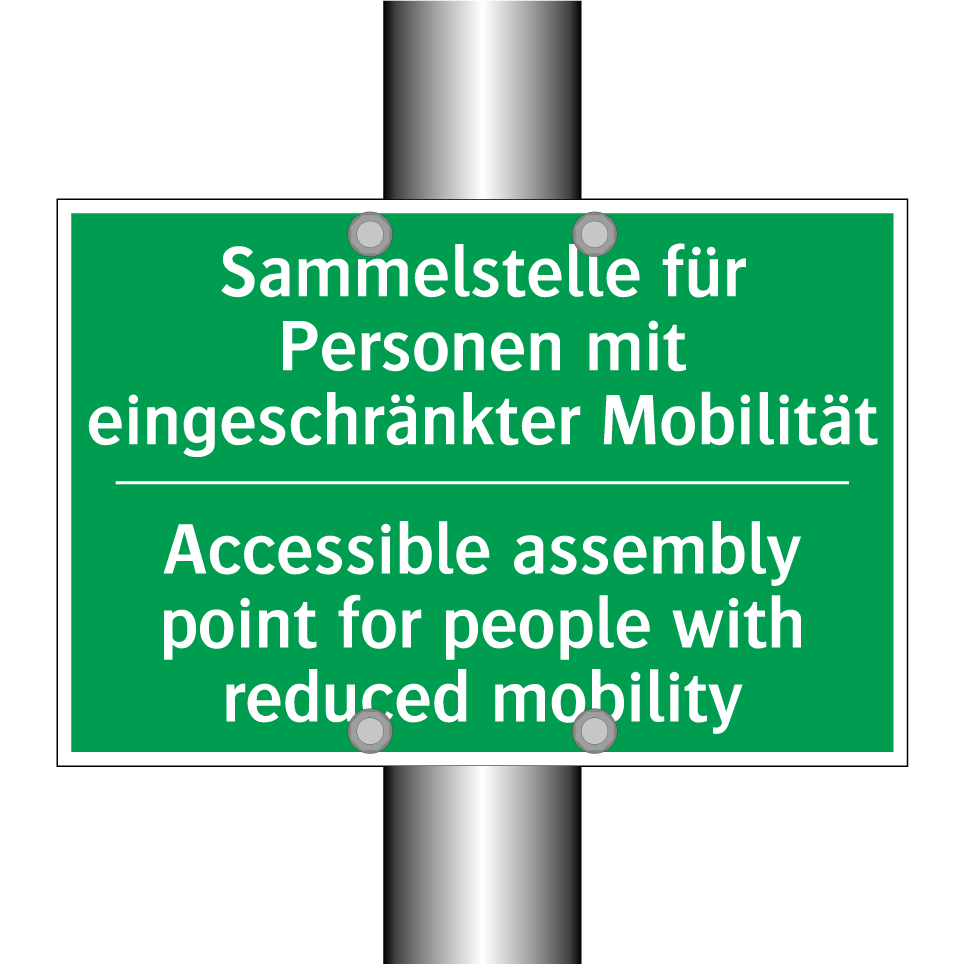 Zweisprachiges Rettungsschild mit deutschem Text Sammelstelle für Personen mit eingeschränkter Mobilität und englischem Text Accessible assembly point for people with reduced mobility
