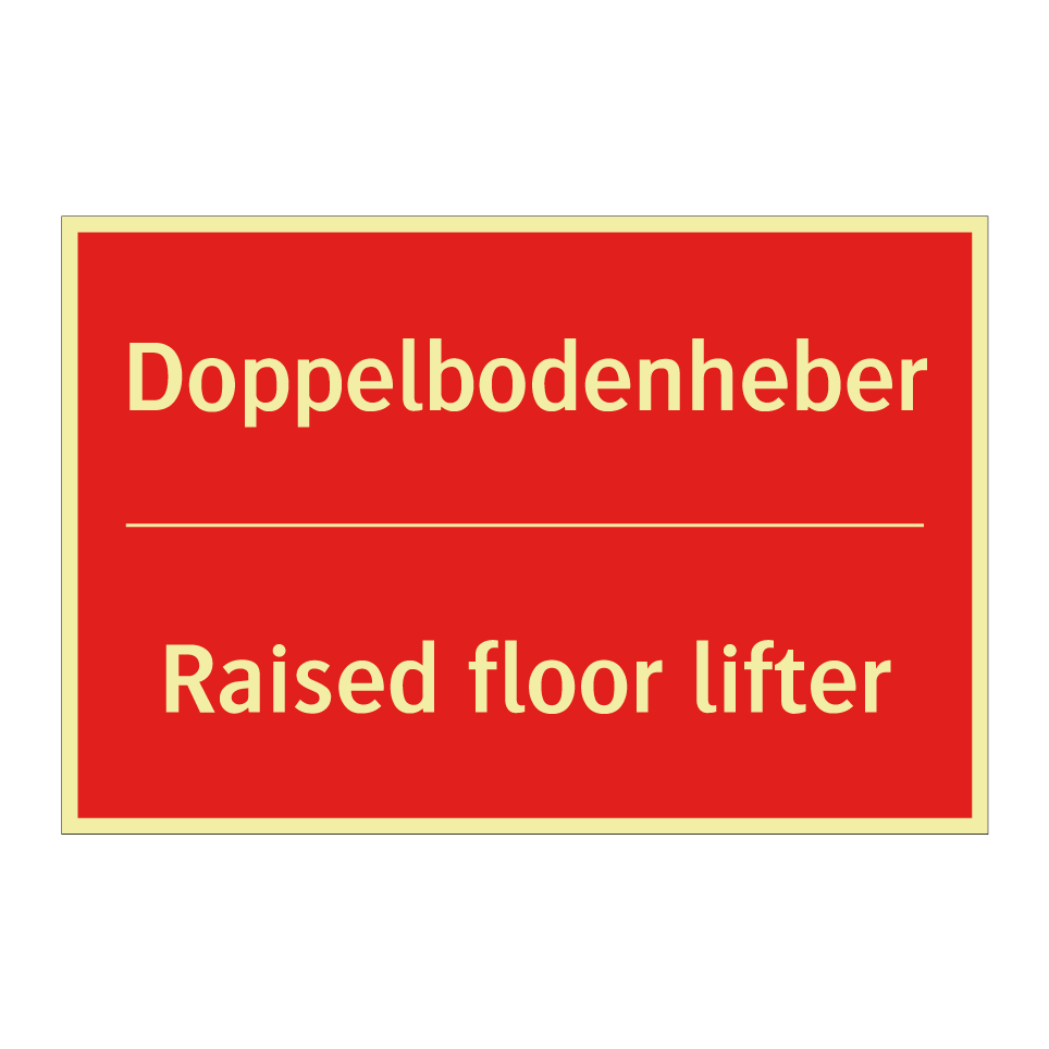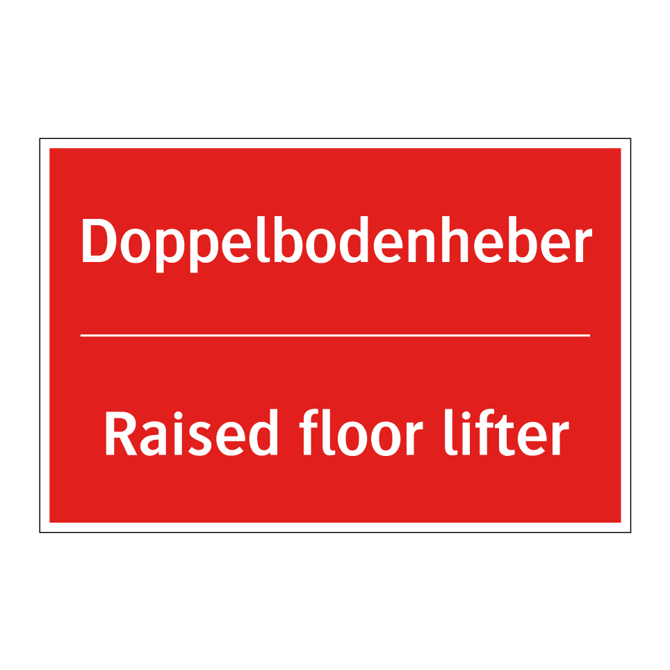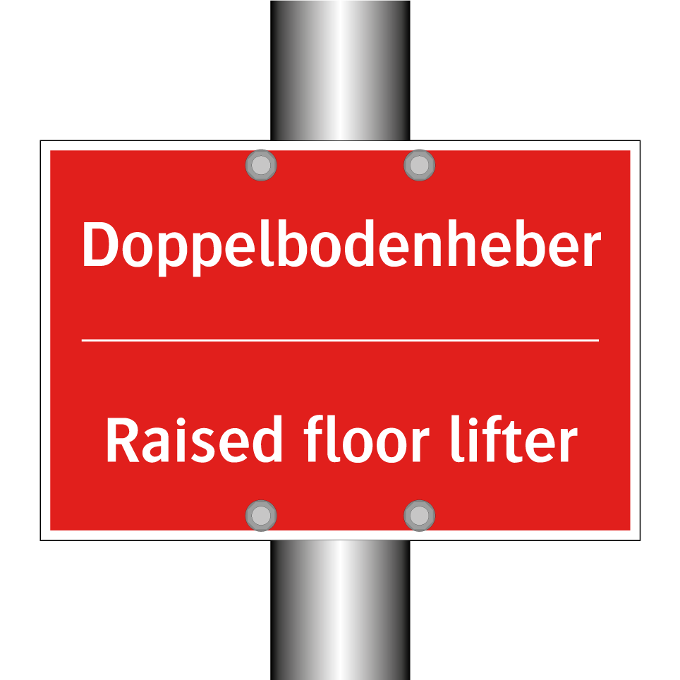 Zweisprachiges Brandschutzschild mit deutschem Text Doppelbodenheber und englischem Text Raised floor lifter