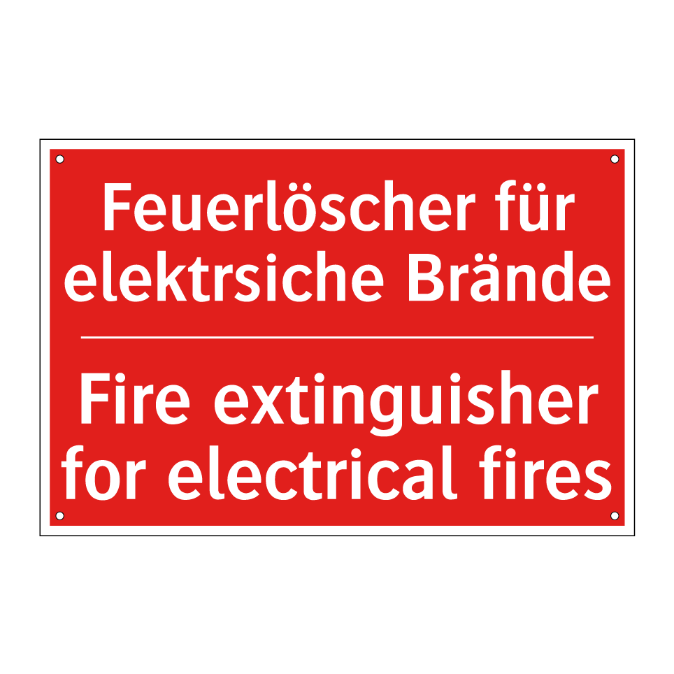 Zweisprachiges Brandschutzschild mit deutschem Text Feuerlöscher für elektrsiche Brände und englischem Text Fire extinguisher for electrical fires