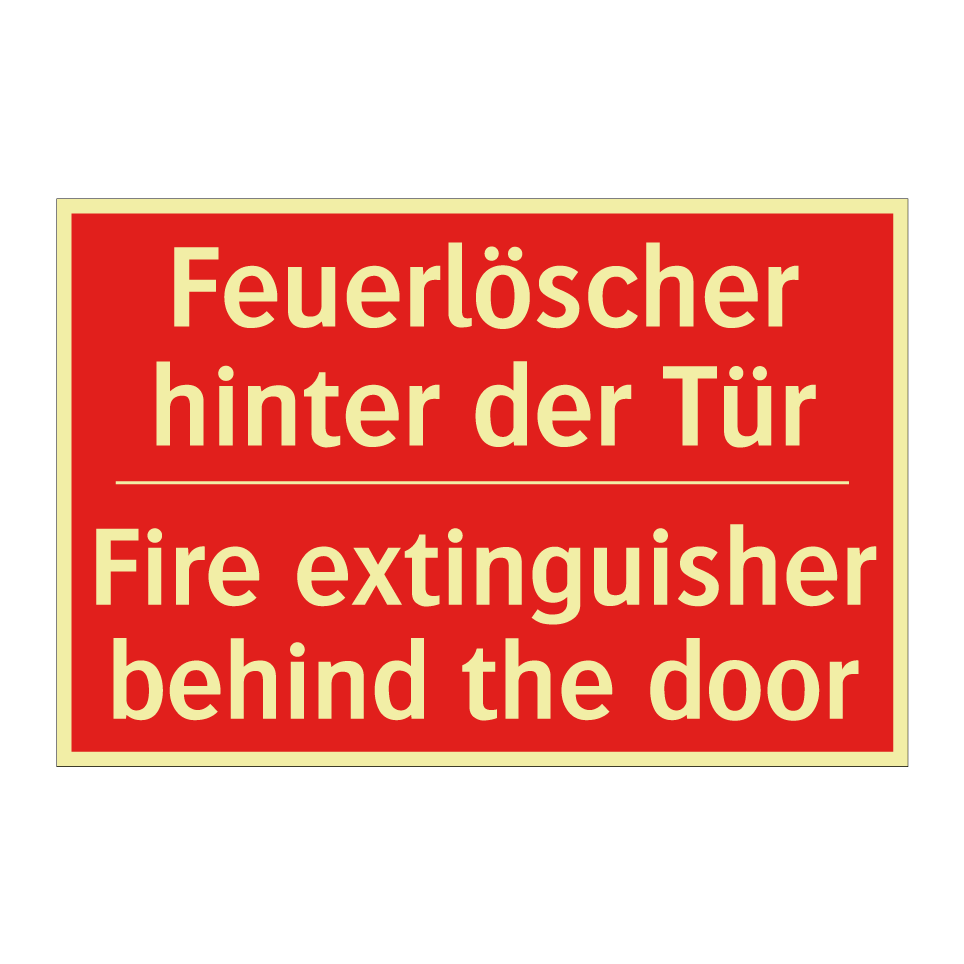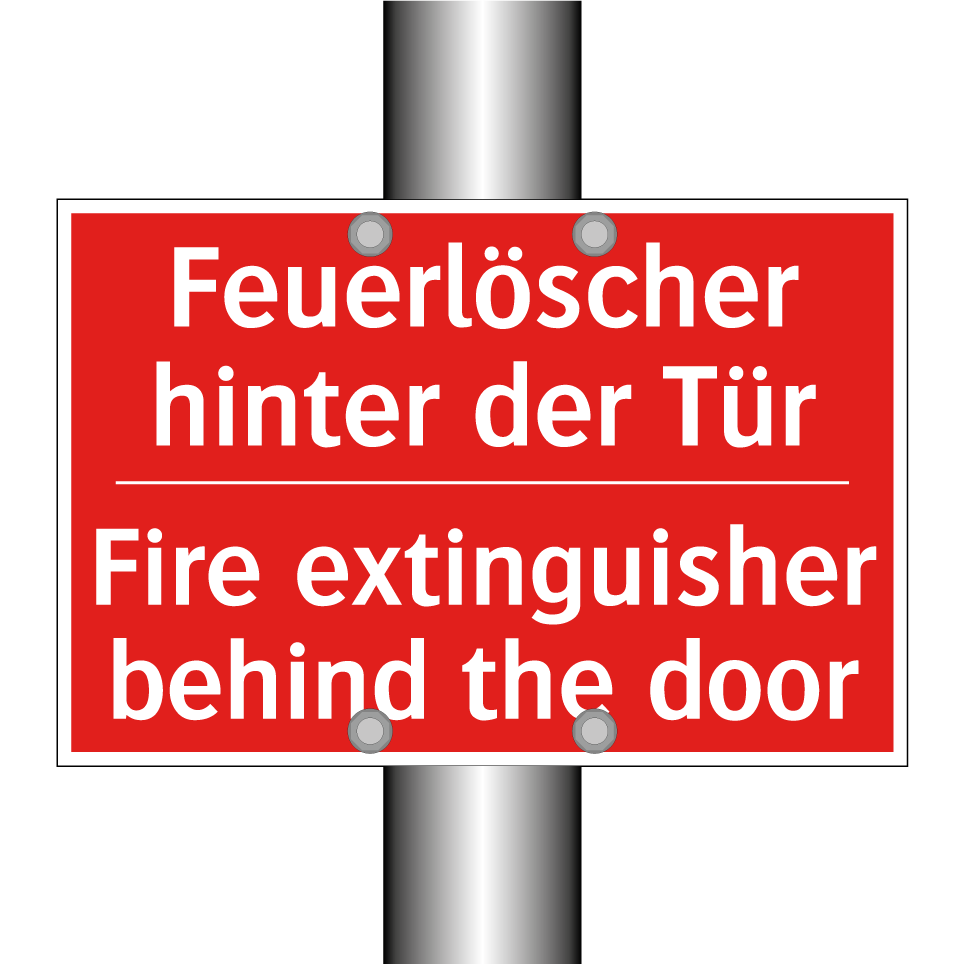 Zweisprachiges Brandschutzschild mit deutschem Text Feuerlöscher hinter der Tür und englischem Text Fire extinguisher behind the door