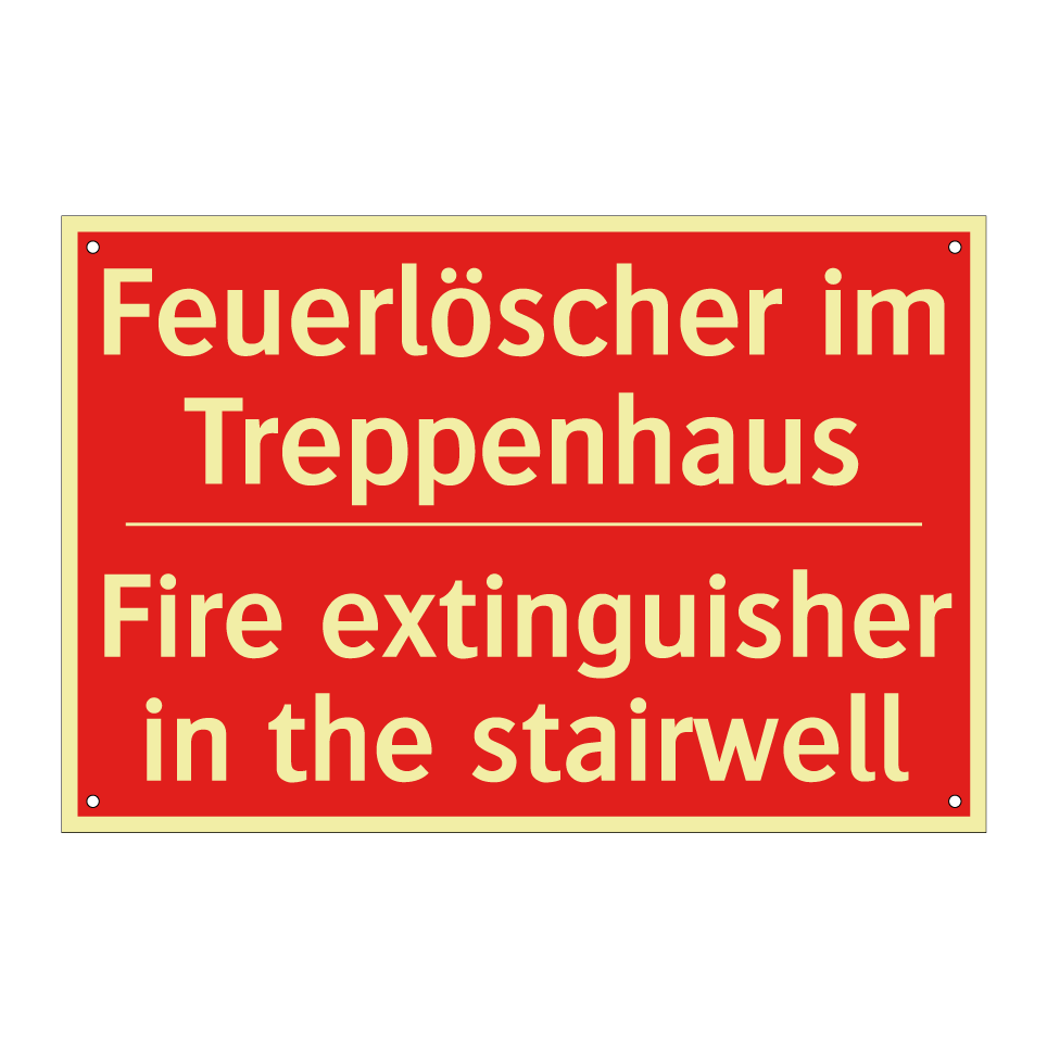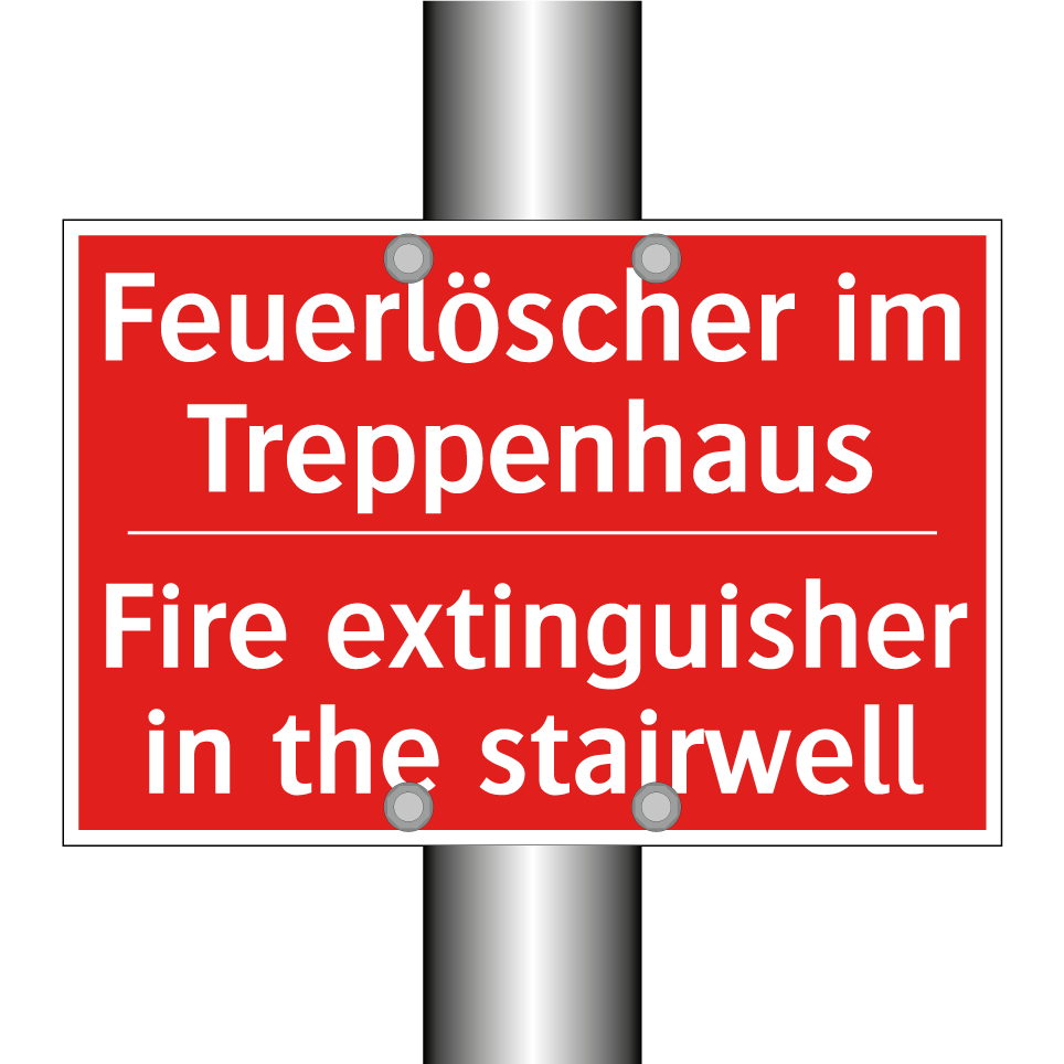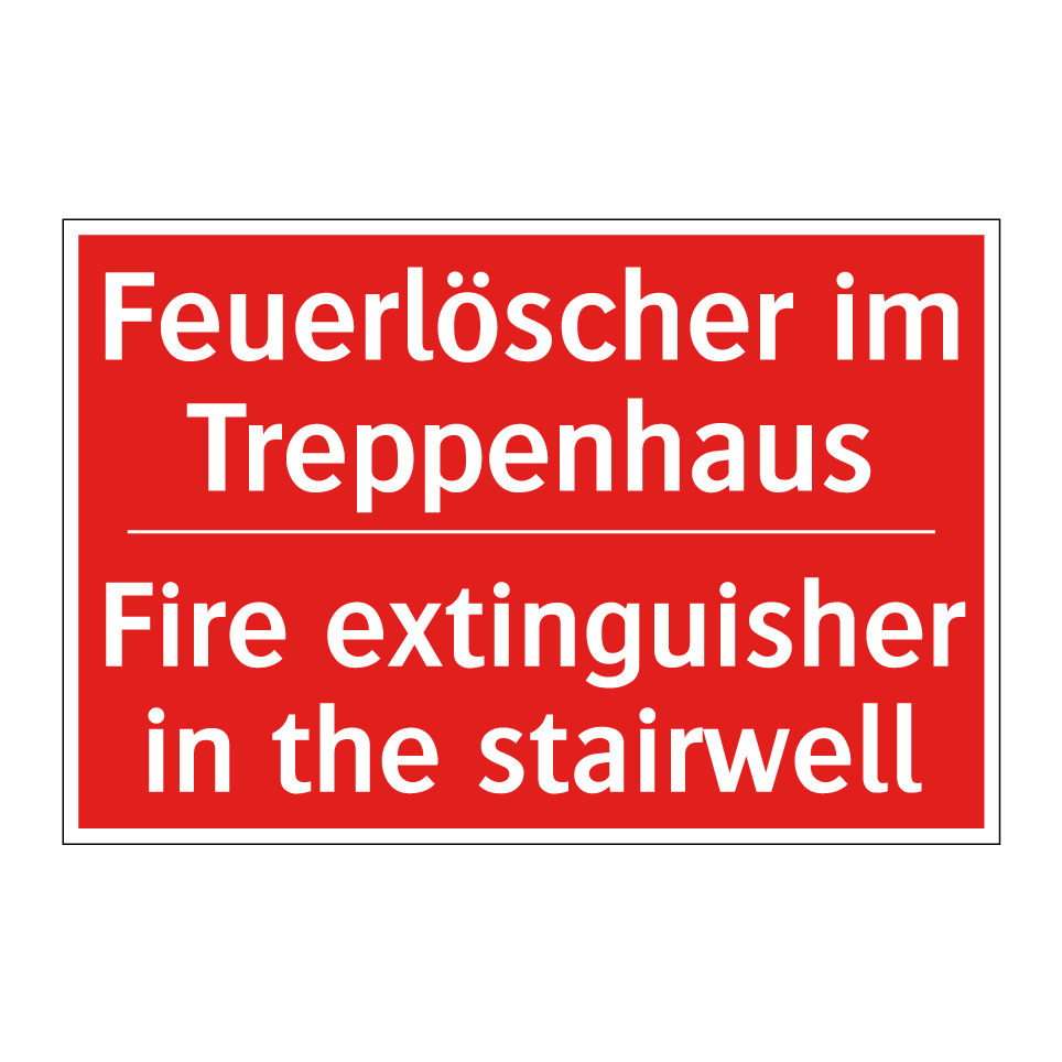 Zweisprachiges Brandschutzschild mit deutschem Text Feuerlöscher im Treppenhaus und englischem Text Fire extinguisher in the stairwell