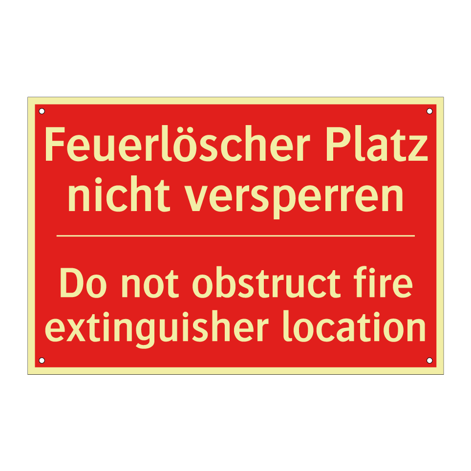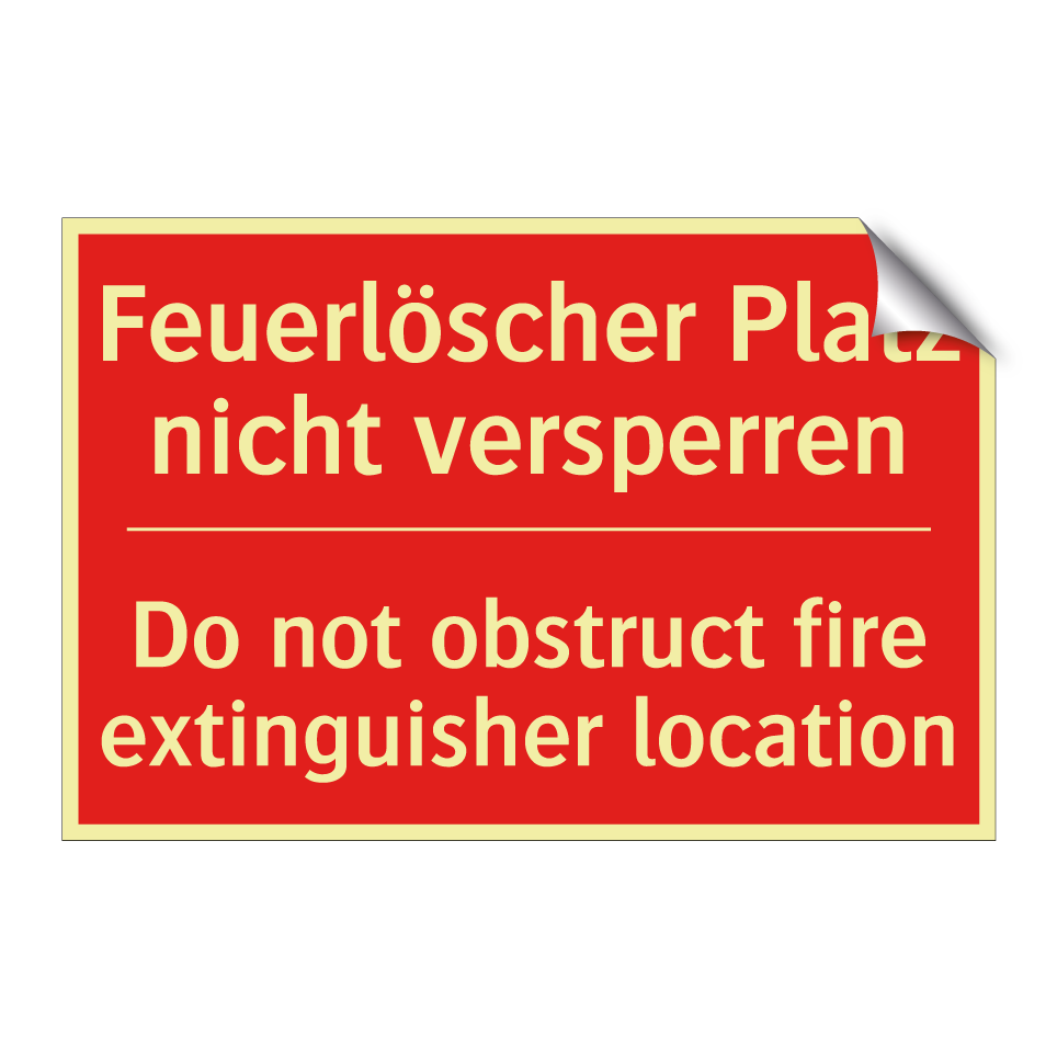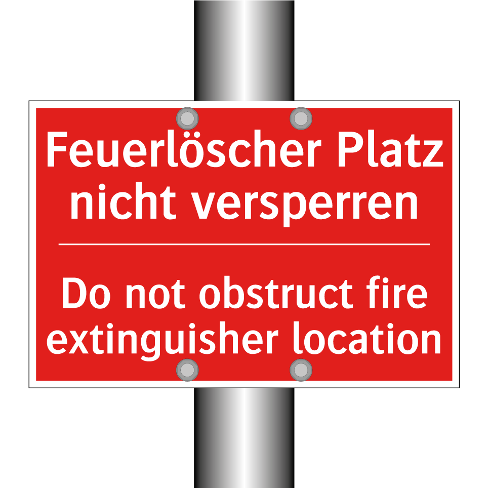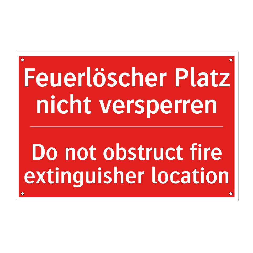 Zweisprachiges Brandschutzschild mit deutschem Text Feuerlöscher Platz nicht versperren und englischem Text Do not obstruct fire extinguisher location
