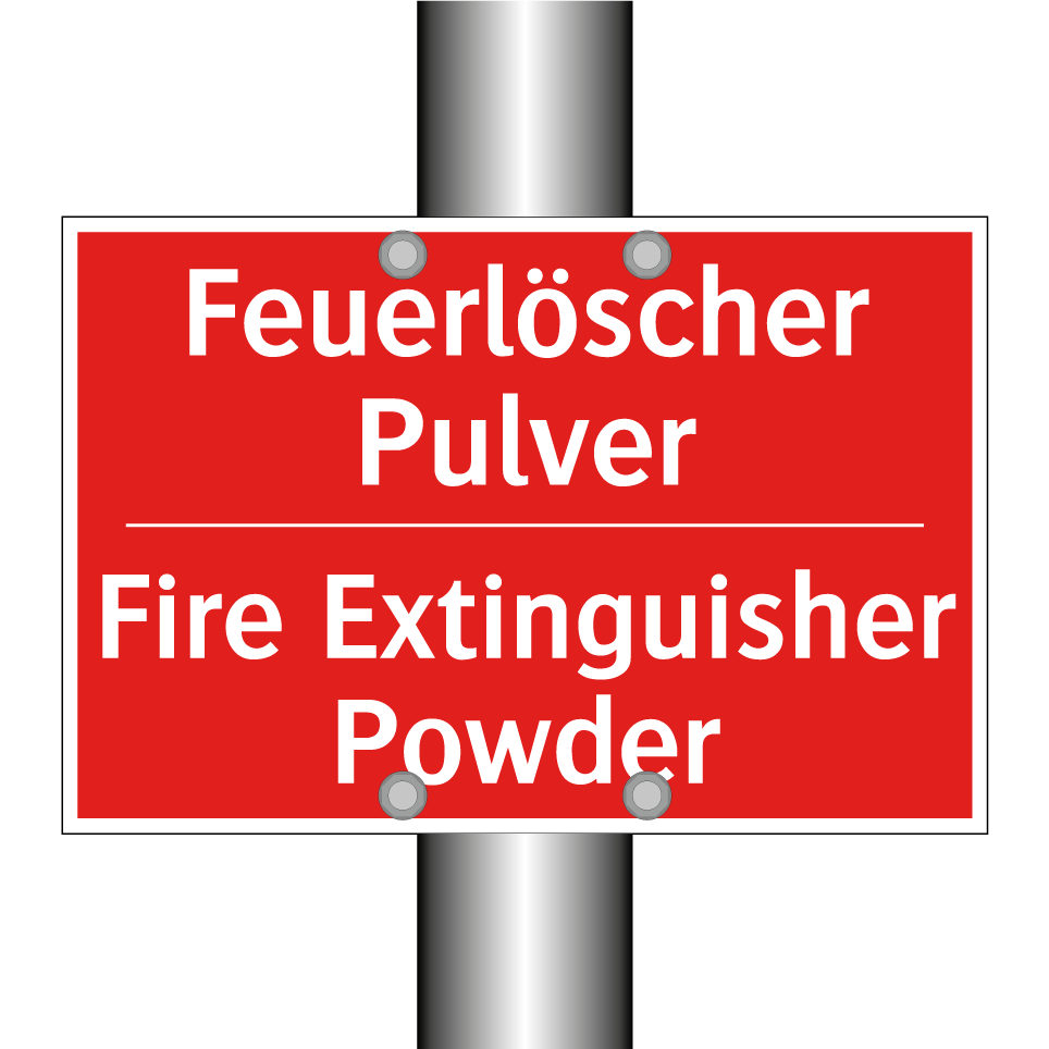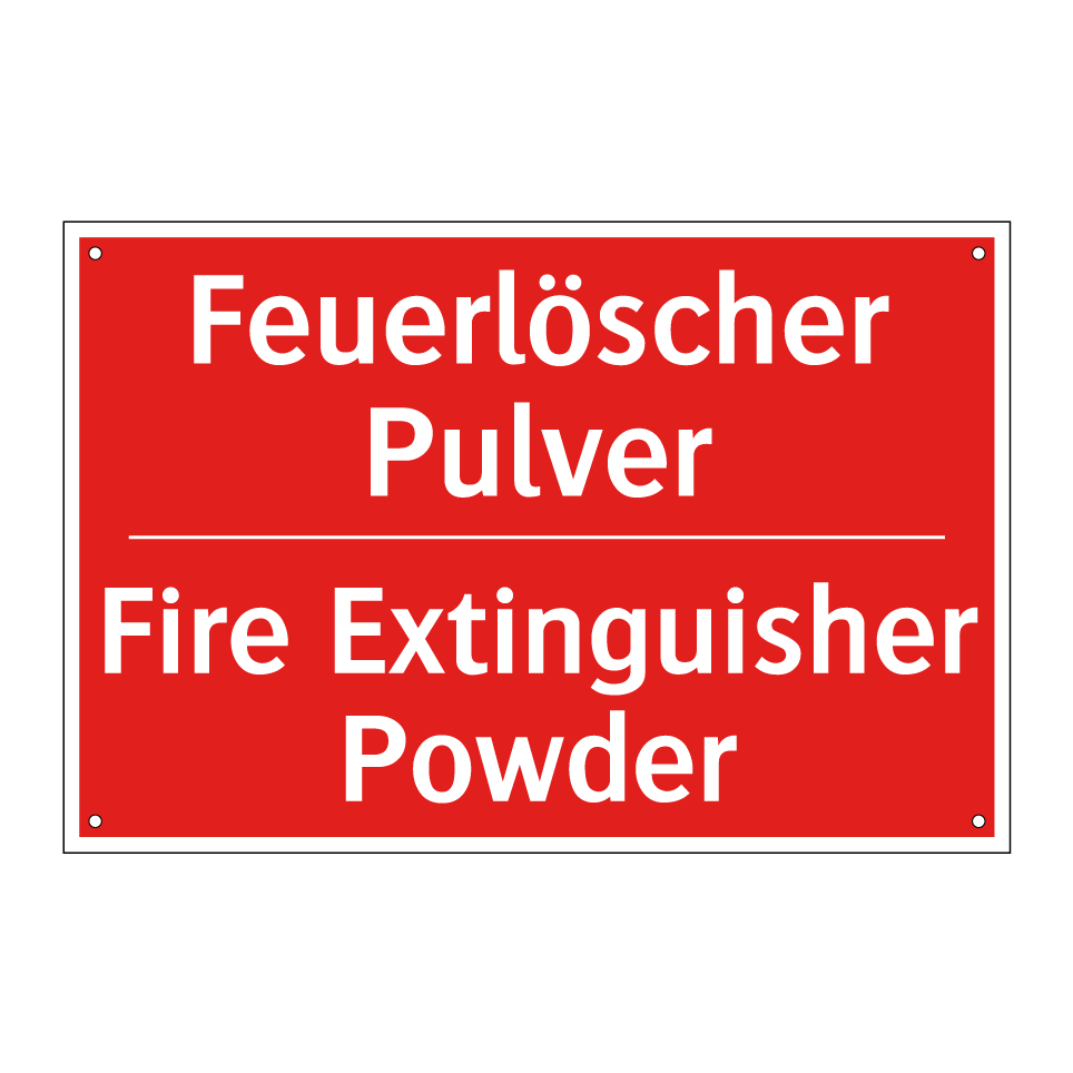 Zweisprachiges Brandschutzschild mit deutschem Text Feuerlöscher Pulver und englischem Text Fire Extinguisher Powder