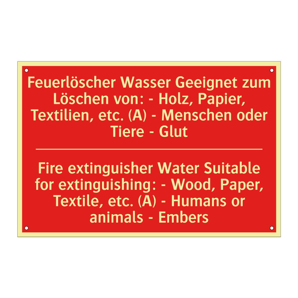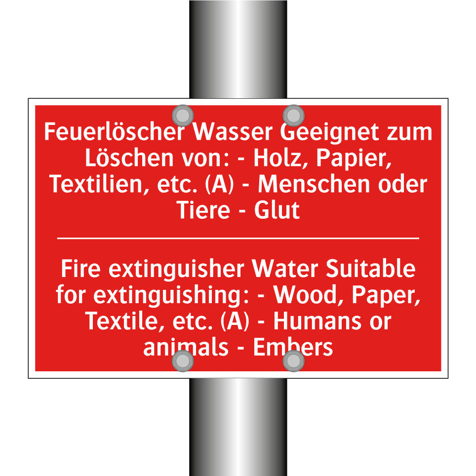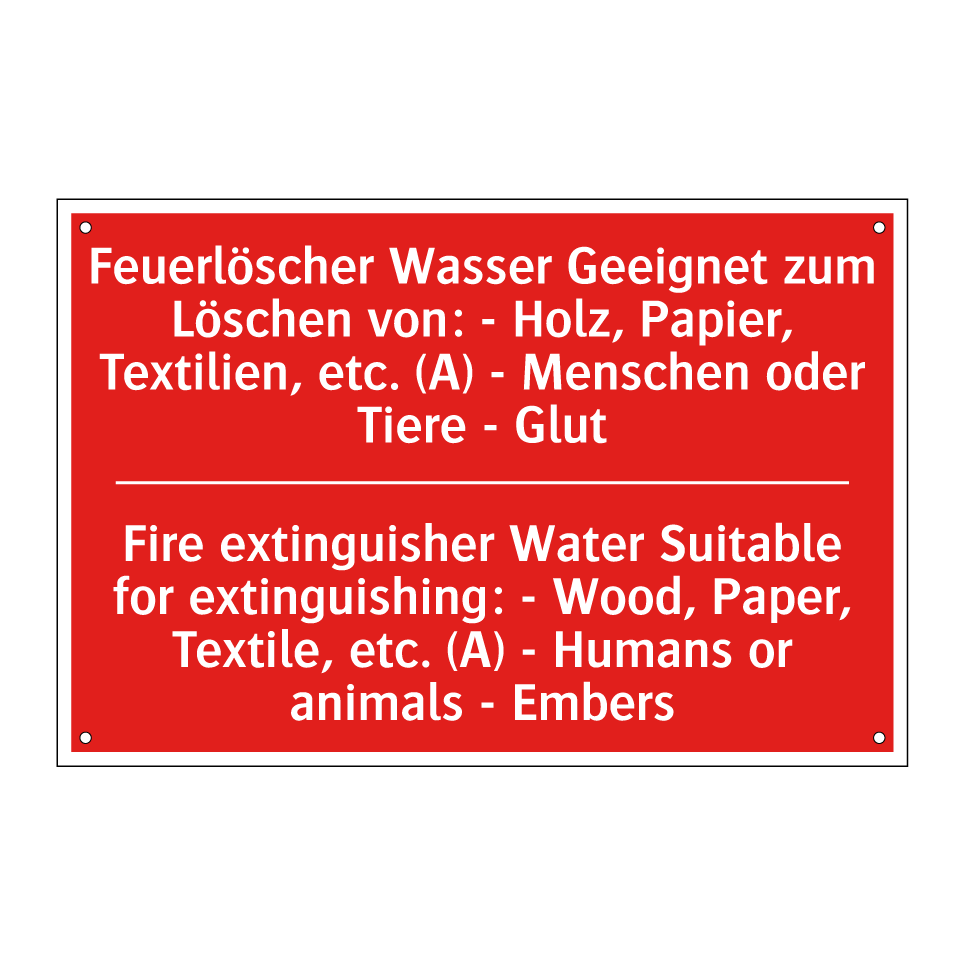 Zweisprachiges Brandschutzschild mit deutschem Text Feuerlöscher Wasser Geeignet zum Löschen von: - Holz, Papier, Textilien, etc. (A) - Menschen oder Tiere - Glut und englischem Text Fire extinguisher Water Suitable for extinguishing: - Wood, Paper, Textile, etc. (A) - Humans or animals - Embers