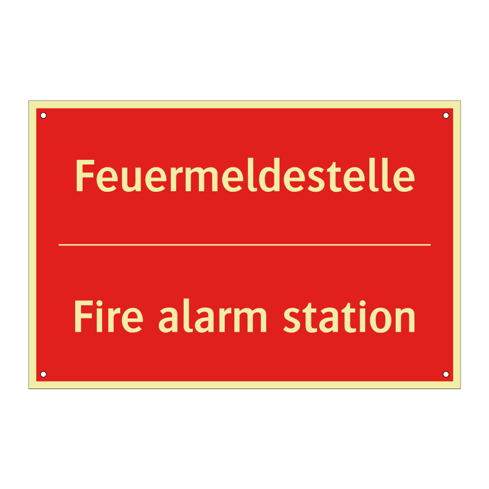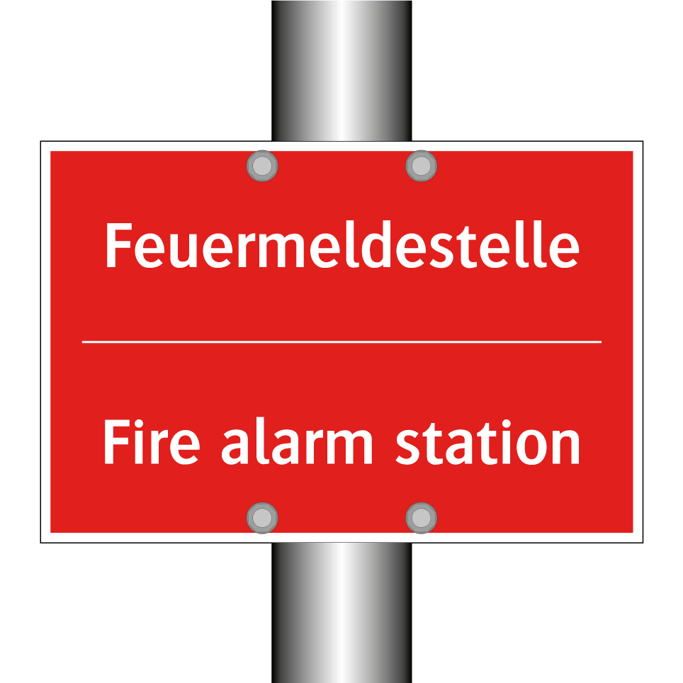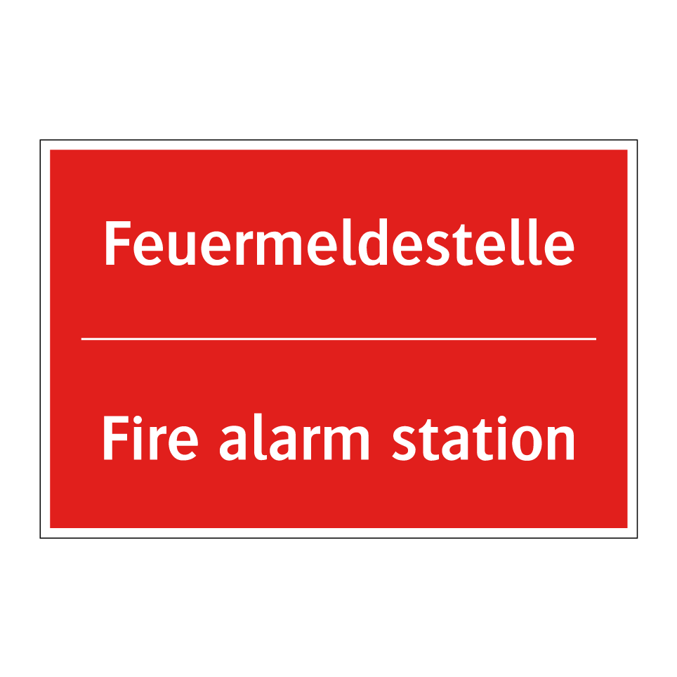 Zweisprachiges Brandschutzschild mit deutschem Text Feuermeldestelle und englischem Text Fire alarm station
