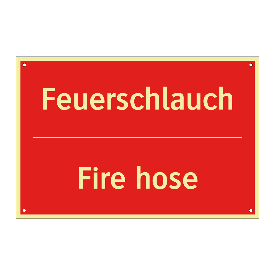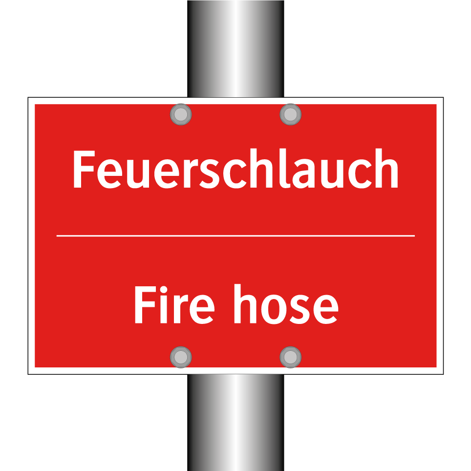 Zweisprachiges Brandschutzschild mit deutschem Text Feuerschlauch und englischem Text Fire hose