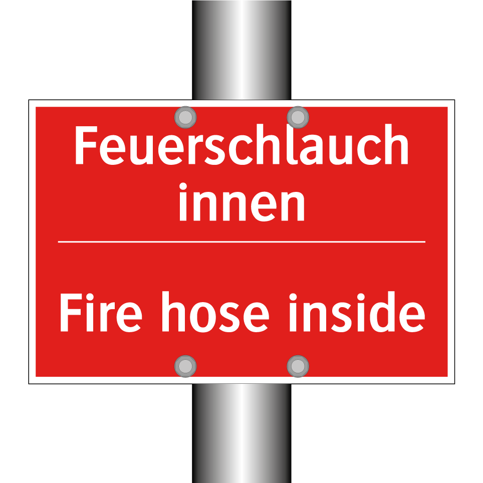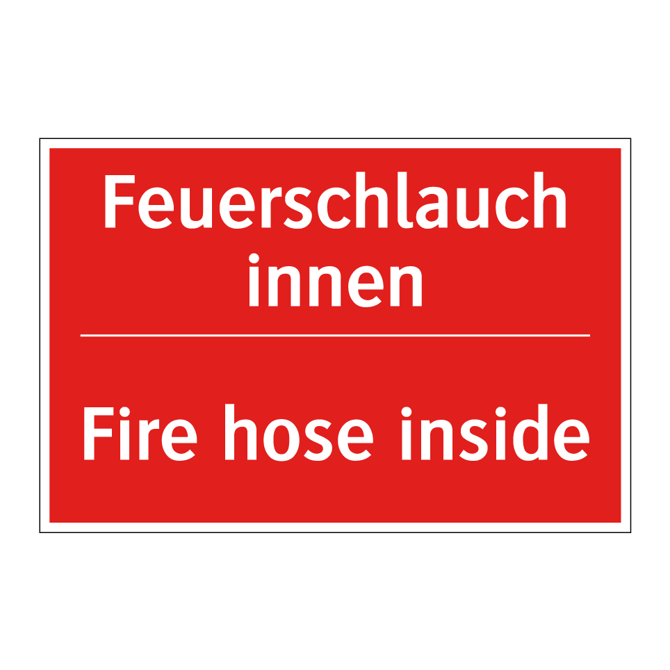 Zweisprachiges Brandschutzschild mit deutschem Text Feuerschlauch innen und englischem Text Fire hose inside