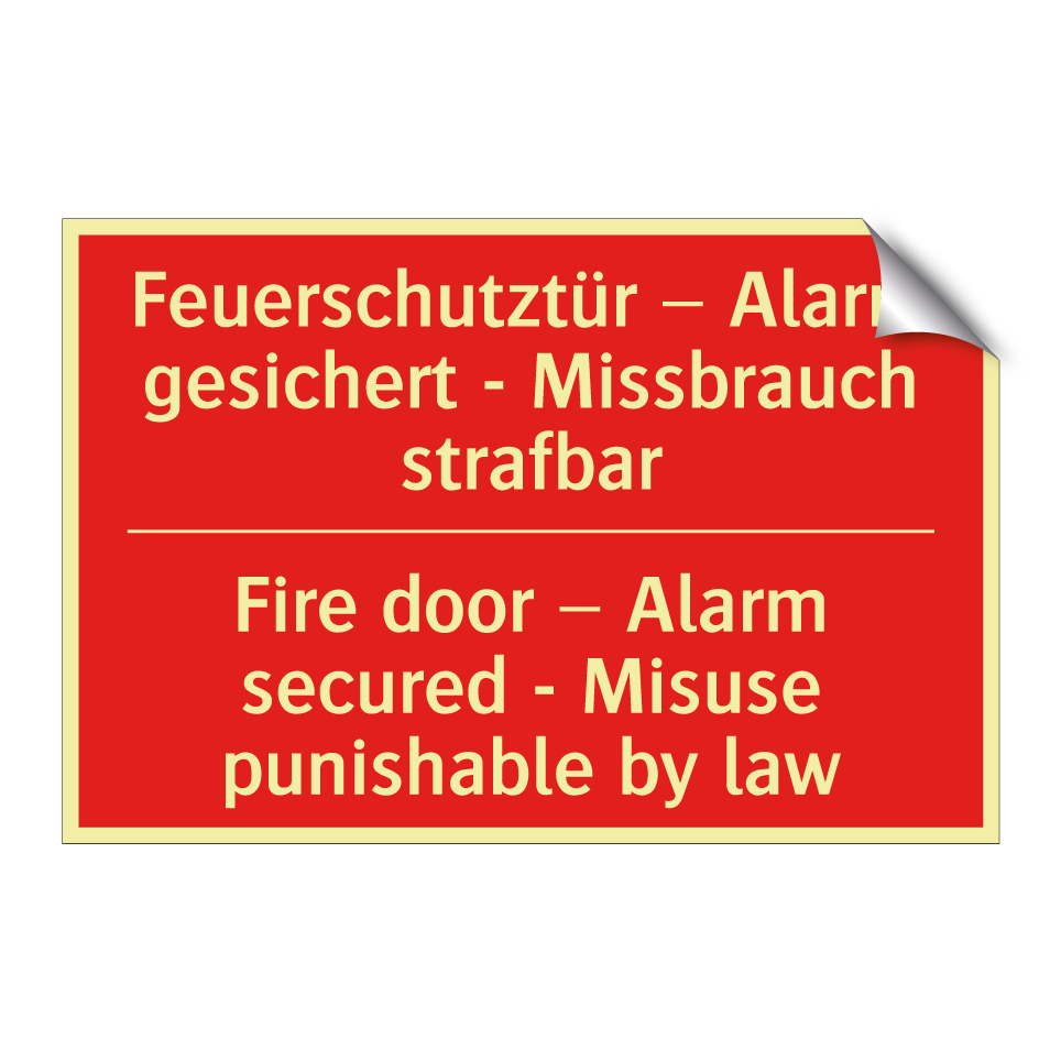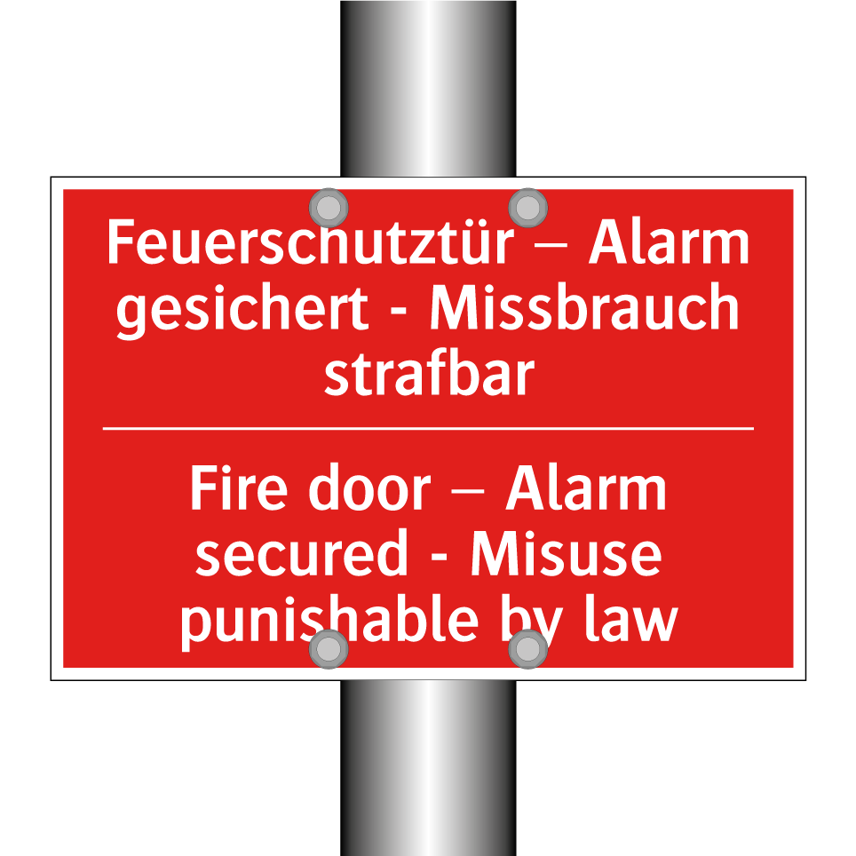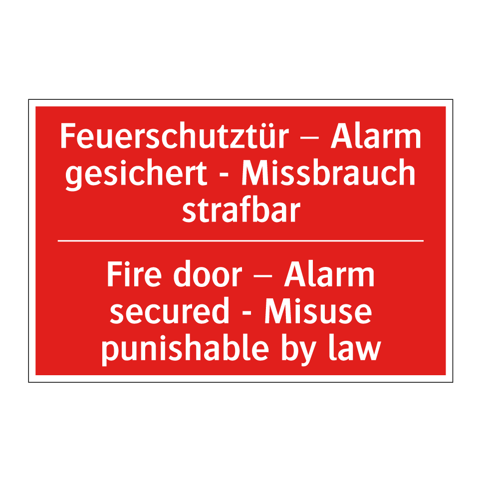 Zweisprachiges Brandschutzschild mit deutschem Text Feuerschutztür – Alarm gesichert - Missbrauch strafbar und englischem Text Fire door – Alarm secured - Misuse punishable by law