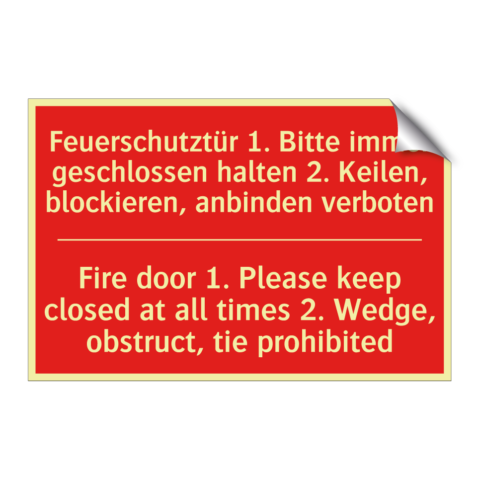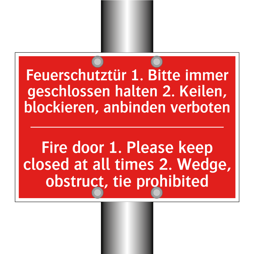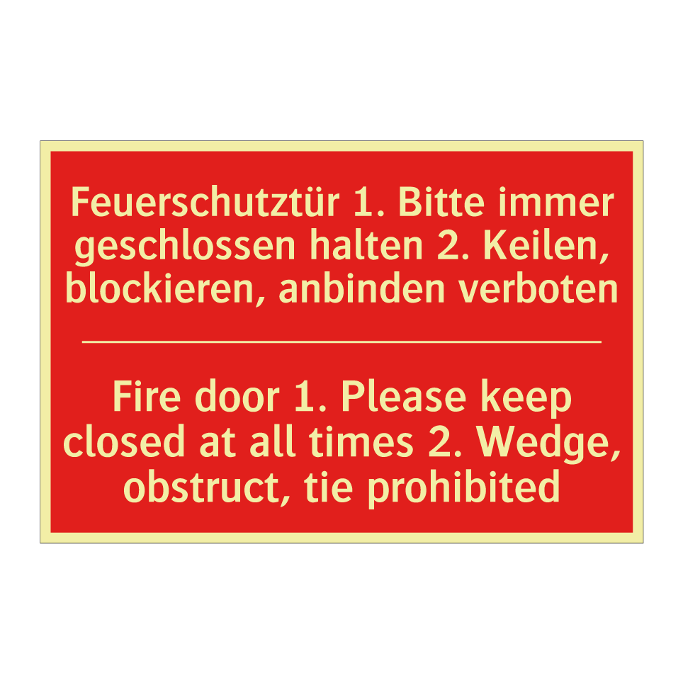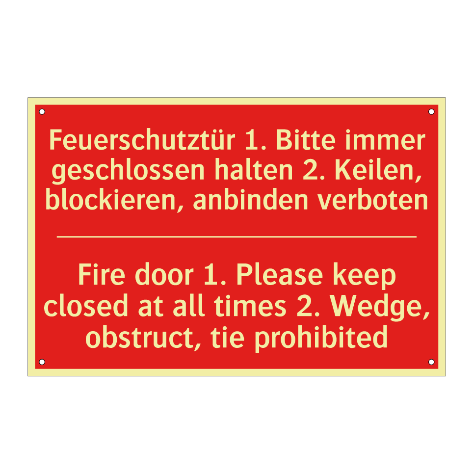 Zweisprachiges Brandschutzschild mit deutschem Text Feuerschutztür 1. Bitte immer geschlossen halten 2. Keilen, blockieren, anbinden verboten und englischem Text Fire door 1. Please keep closed at all times 2. Wedge, obstruct, tie prohibited