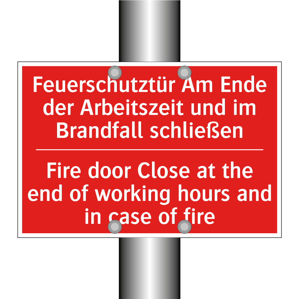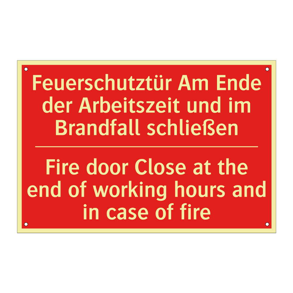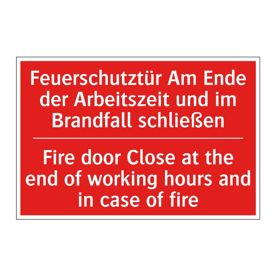 Zweisprachiges Brandschutzschild mit deutschem Text Feuerschutztür Am Ende der Arbeitszeit und im Brandfall schließen und englischem Text Fire door Close at the end of working hours and in case of fire