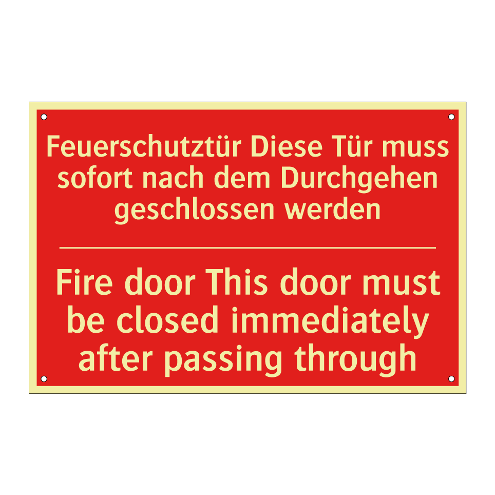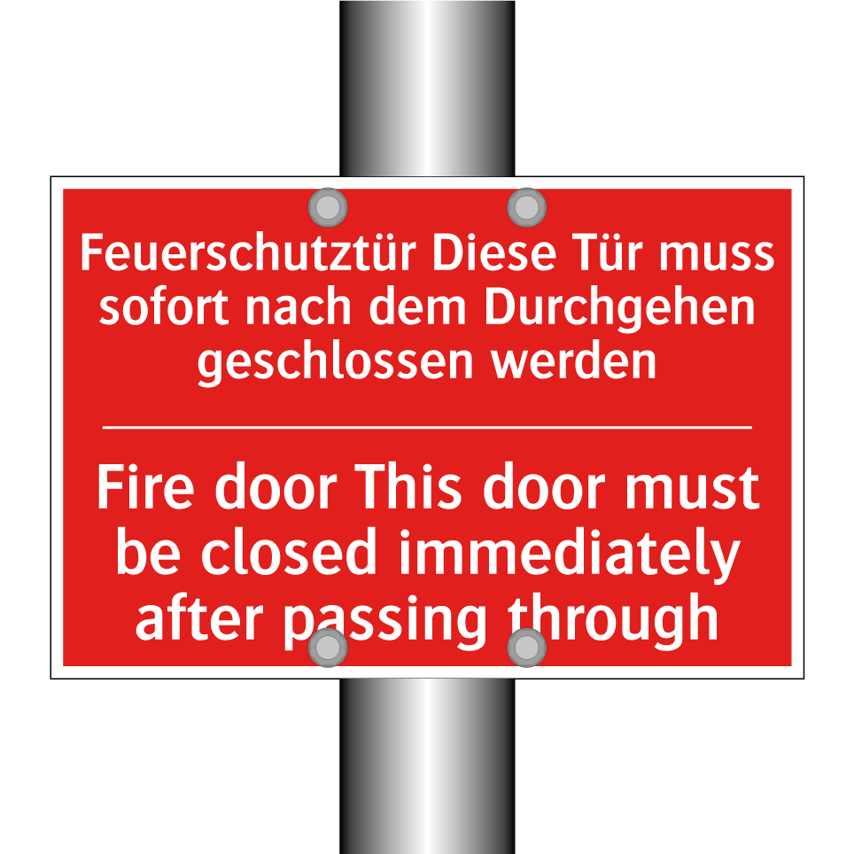 Zweisprachiges Brandschutzschild mit deutschem Text Feuerschutztür Diese Tür muss sofort nach dem Durchgehen geschlossen werden und englischem Text Fire door This door must be closed immediately after passing through