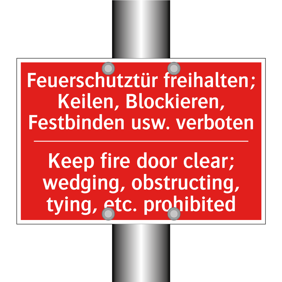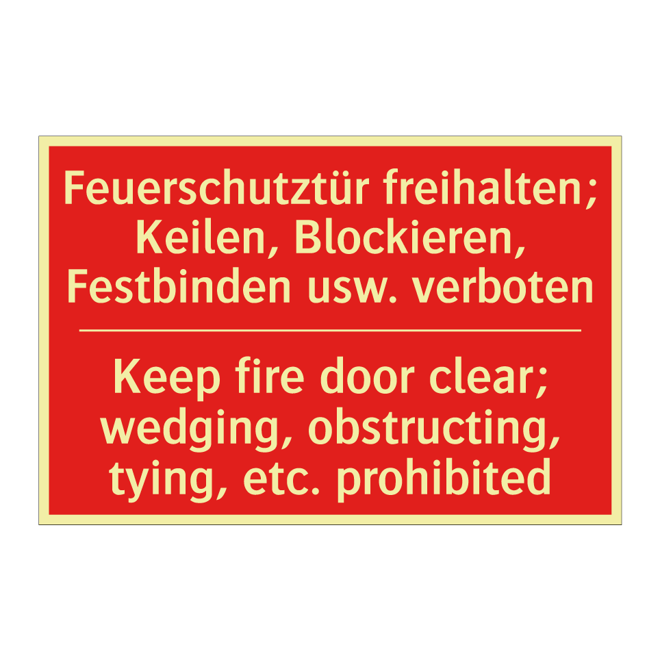 Zweisprachiges Brandschutzschild mit deutschem Text Feuerschutztür freihalten; Keilen, Blockieren, Festbinden usw. verboten und englischem Text Keep fire door clear; wedging, obstructing, tying, etc. prohibited
