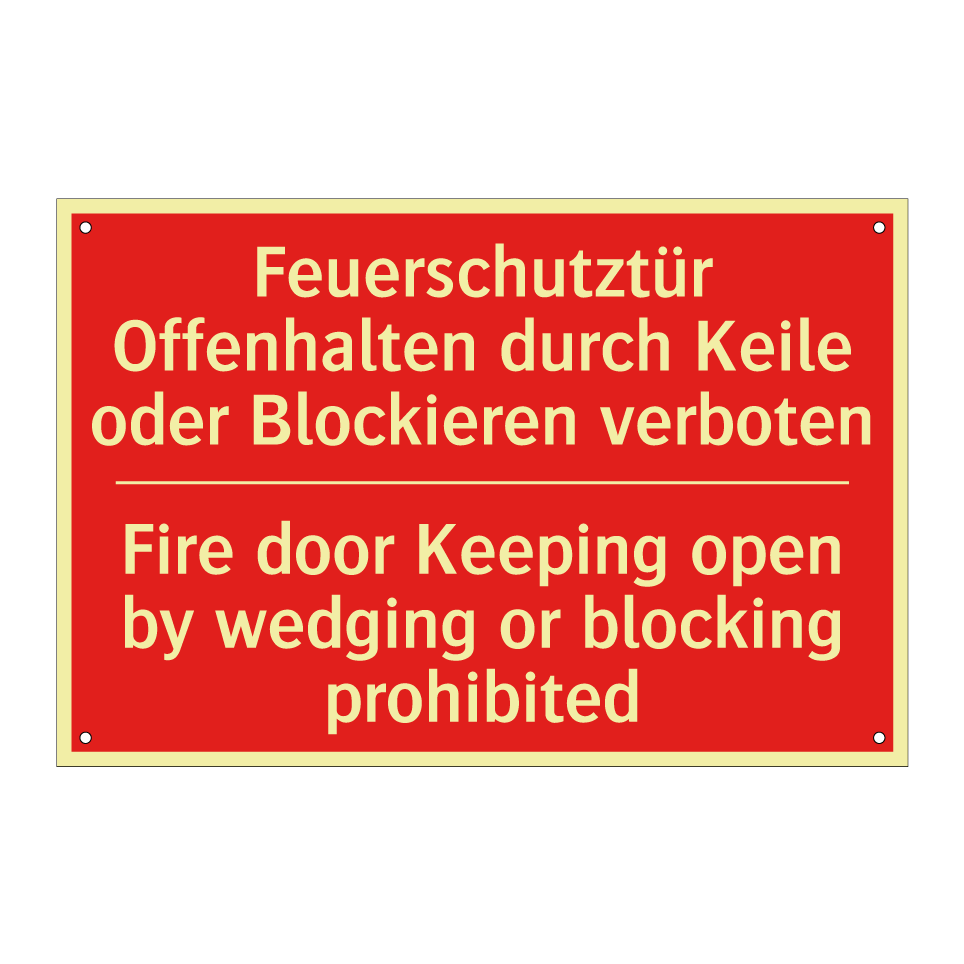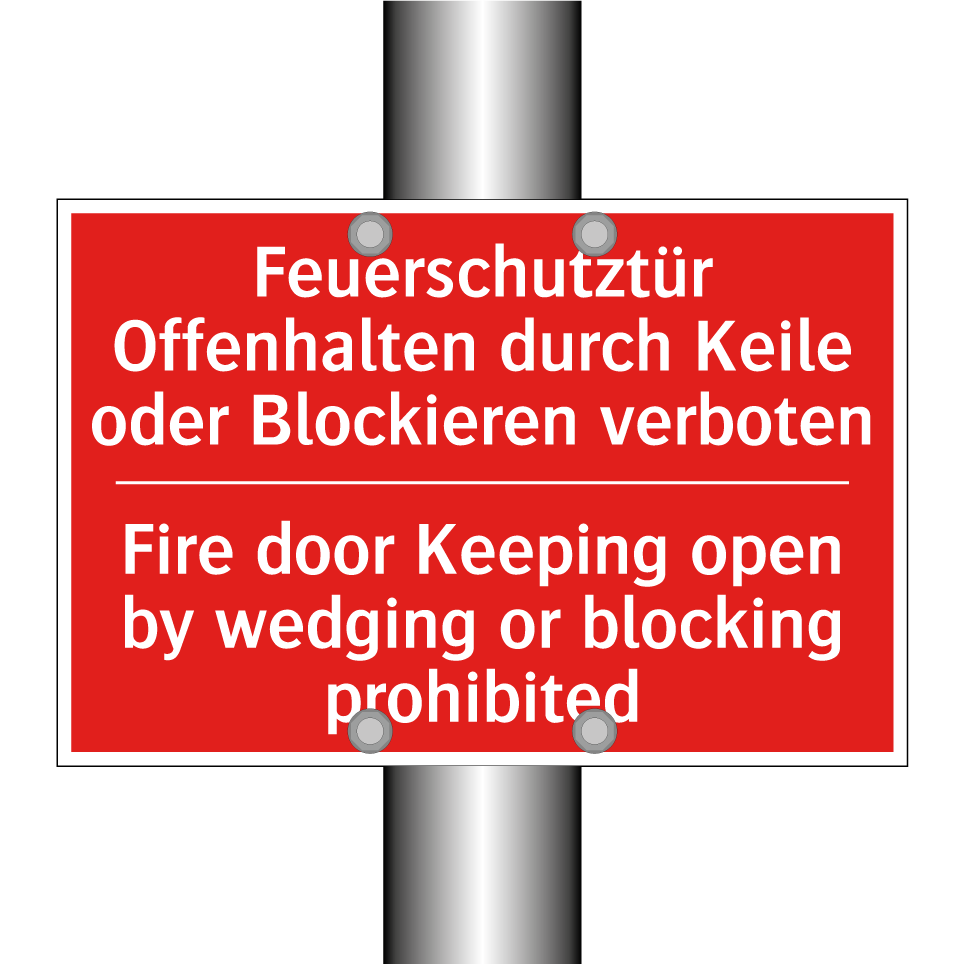 Zweisprachiges Brandschutzschild mit deutschem Text Feuerschutztür Offenhalten durch Keile oder Blockieren verboten und englischem Text Fire door Keeping open by wedging or blocking prohibited