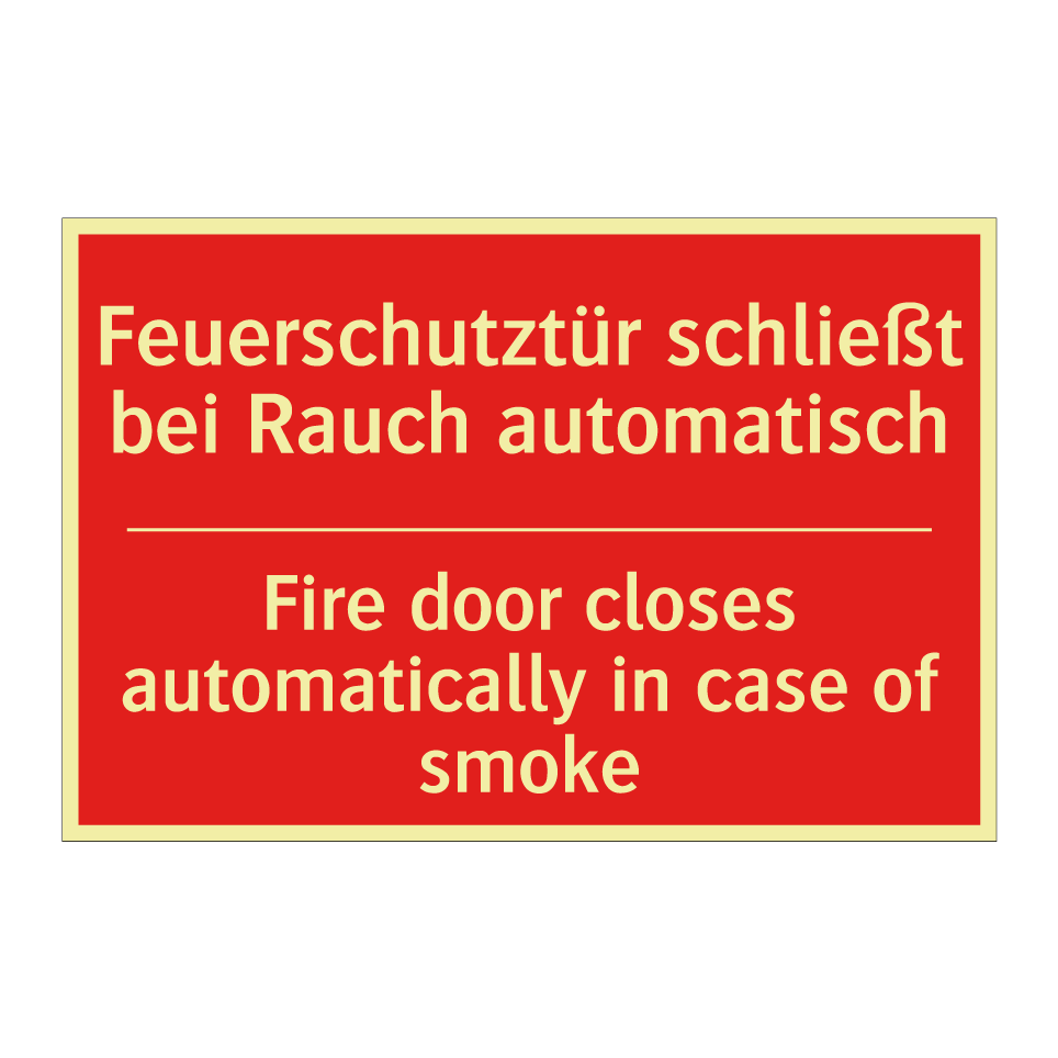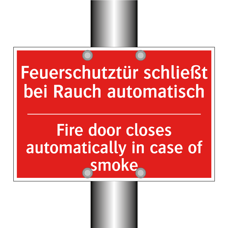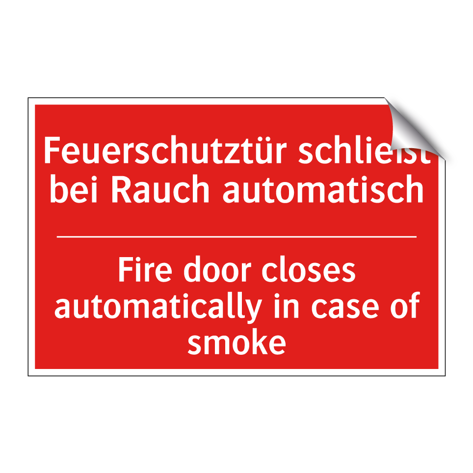 Zweisprachiges Brandschutzschild mit deutschem Text Feuerschutztür schließt bei Rauch automatisch und englischem Text Fire door closes automatically in case of smoke