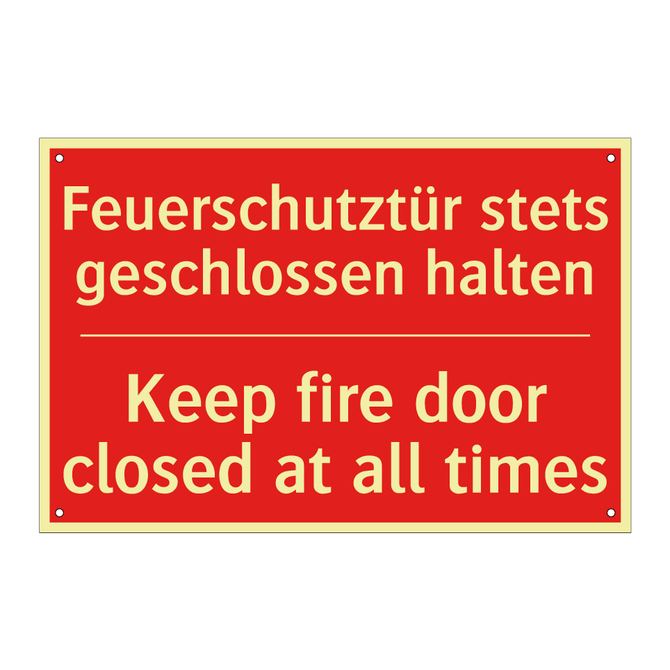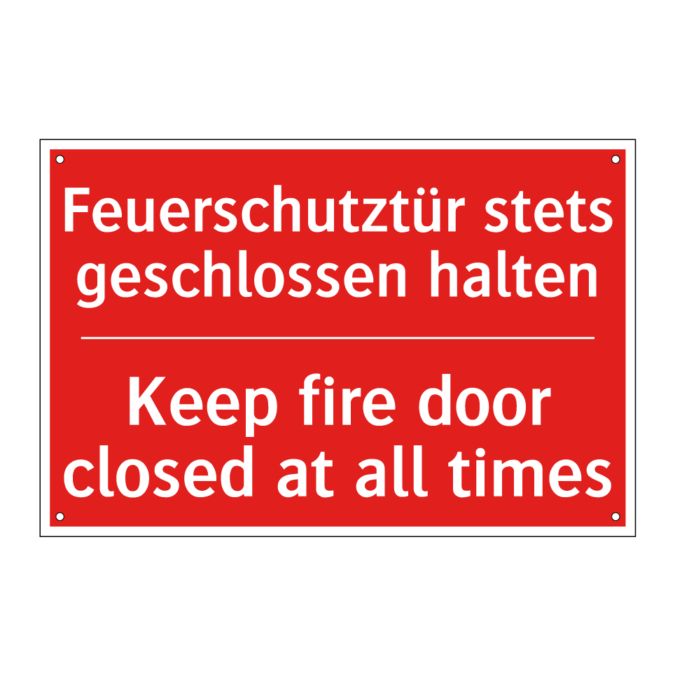 Zweisprachiges Brandschutzschild mit deutschem Text Feuerschutztür stets geschlossen halten und englischem Text Keep fire door closed at all times