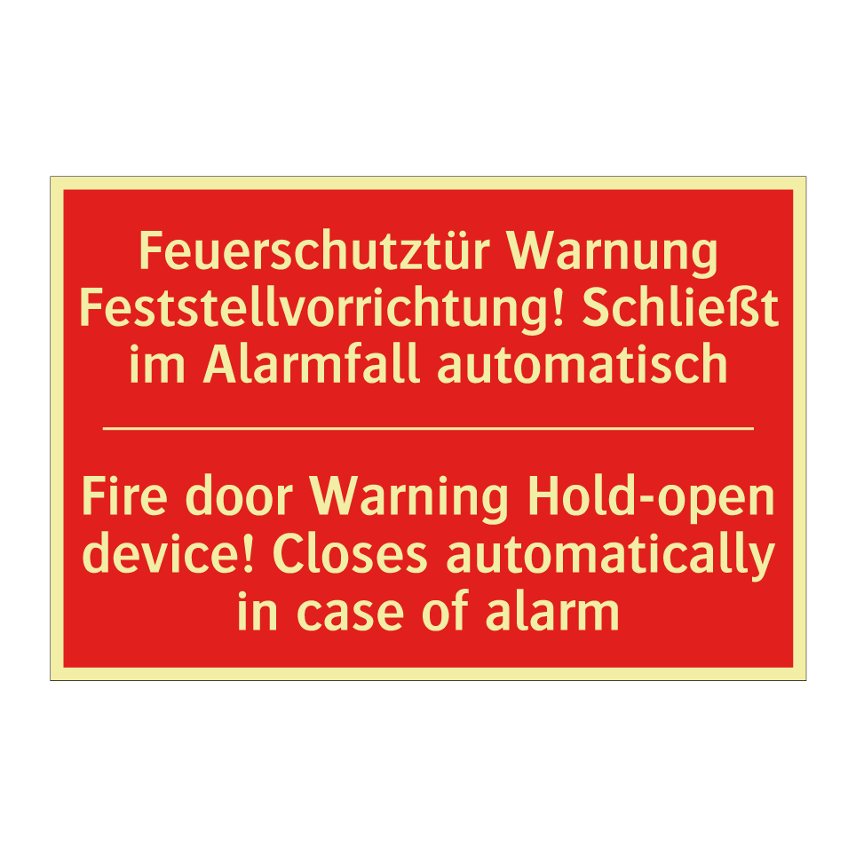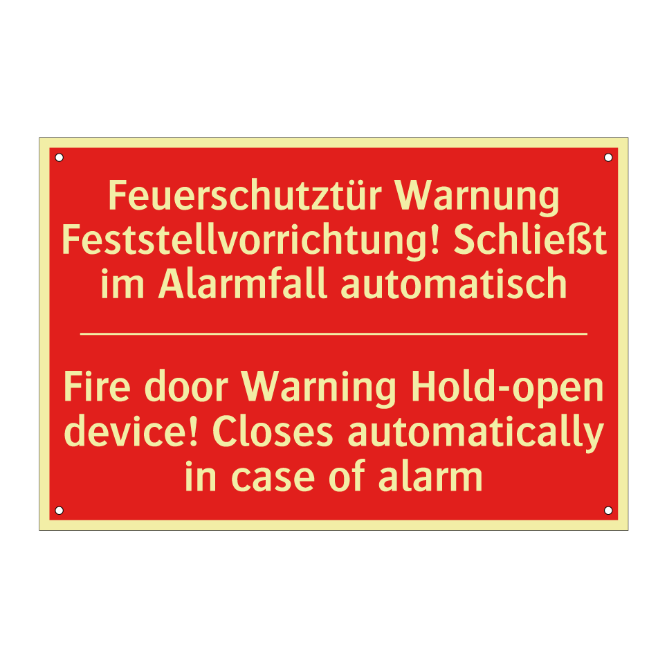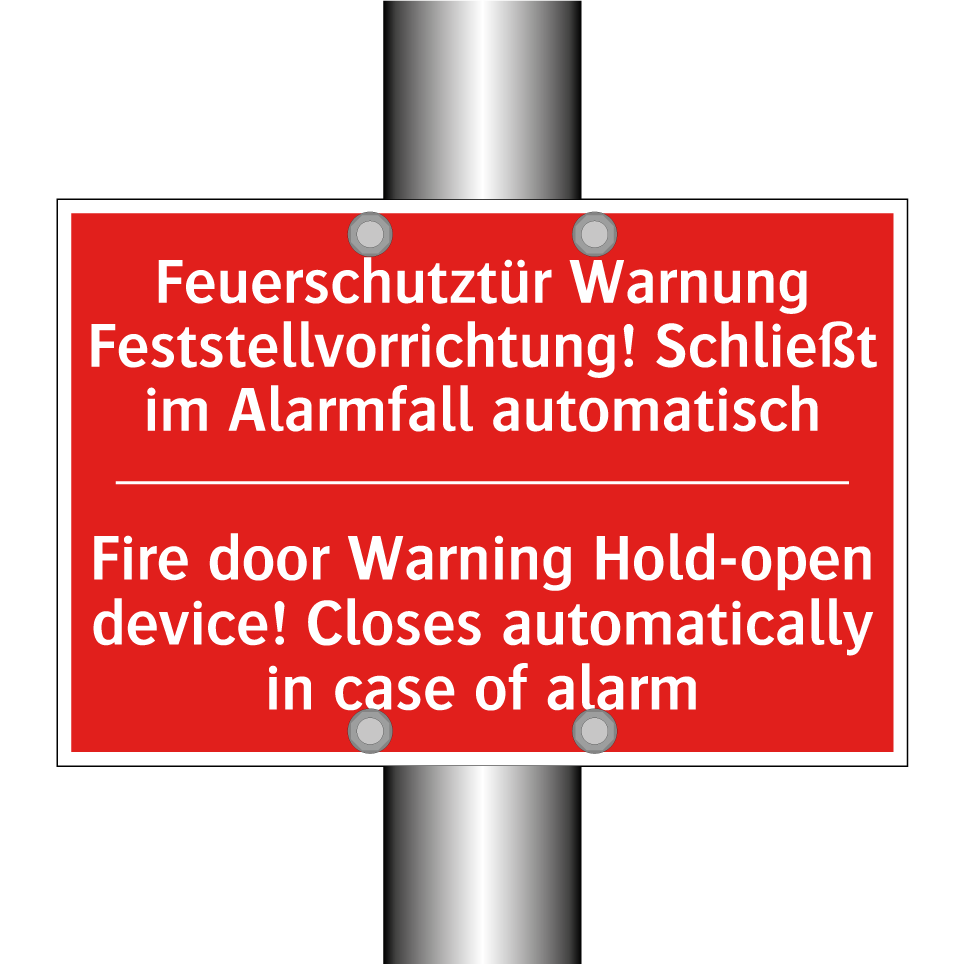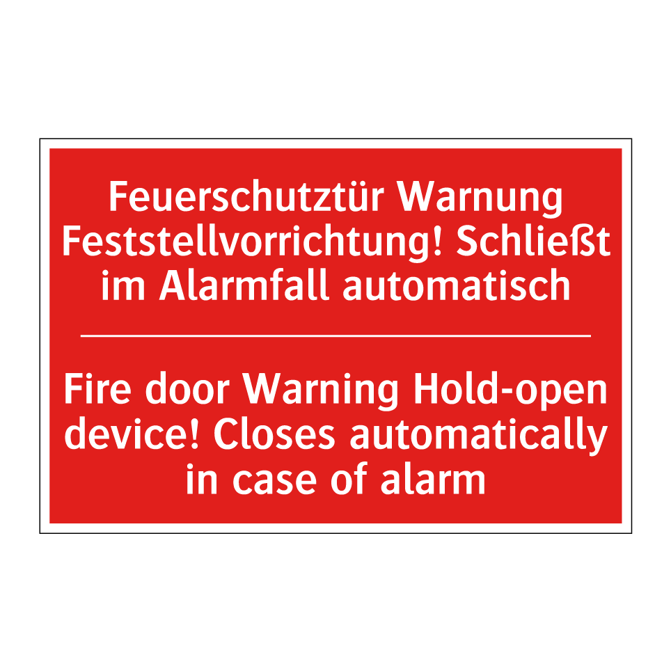 Zweisprachiges Brandschutzschild mit deutschem Text Feuerschutztür Warnung Feststellvorrichtung! Schließt im Alarmfall automatisch und englischem Text Fire door Warning Hold-open device! Closes automatically in case of alarm