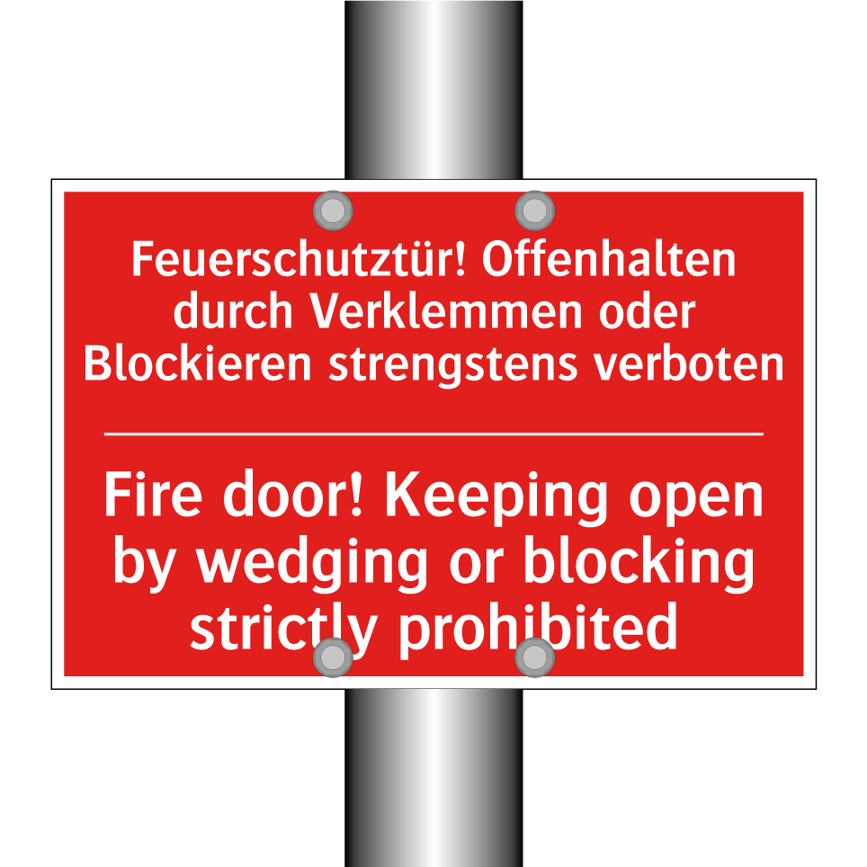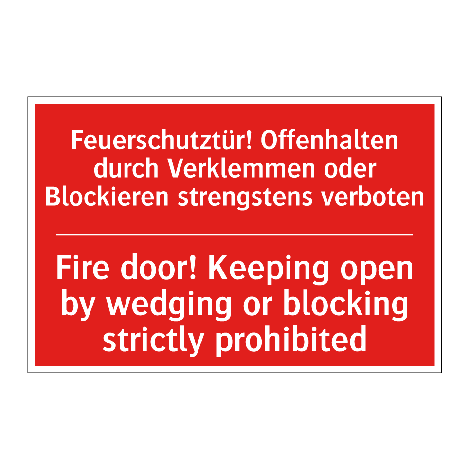 Zweisprachiges Brandschutzschild mit deutschem Text Feuerschutztür! Offenhalten durch Verklemmen oder Blockieren strengstens verboten und englischem Text Fire door! Keeping open by wedging or blocking strictly prohibited