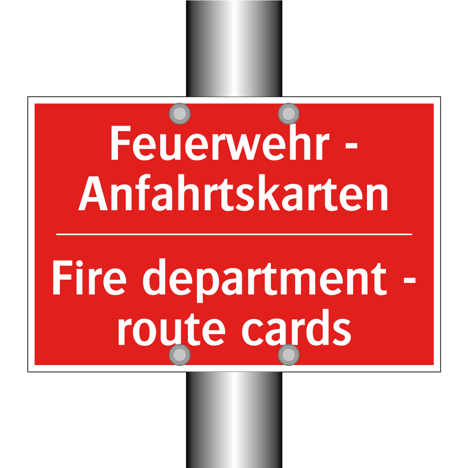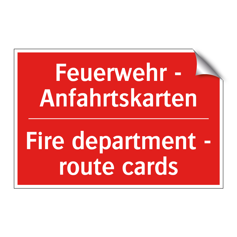 Zweisprachiges Brandschutzschild mit deutschem Text Feuerwehr - Anfahrtskarten und englischem Text Fire department - route cards