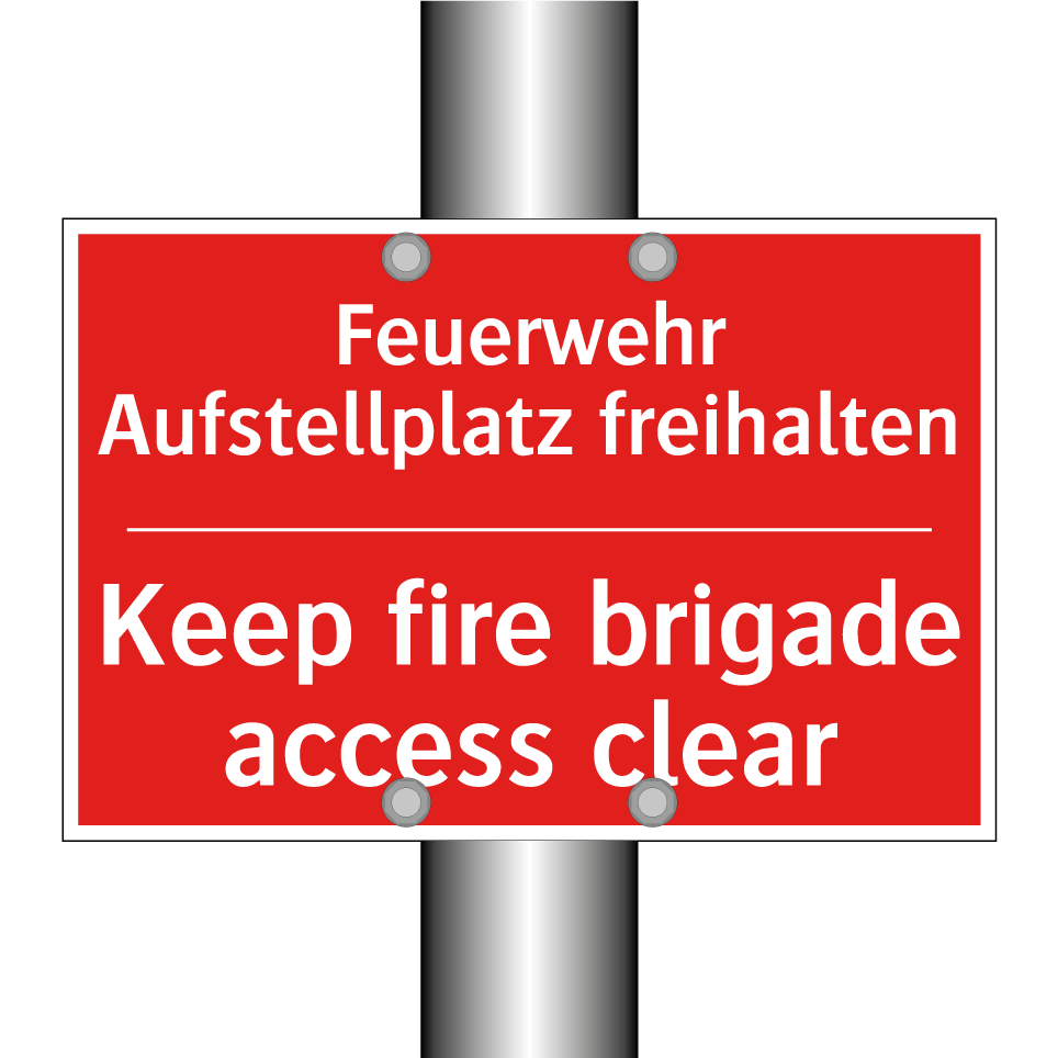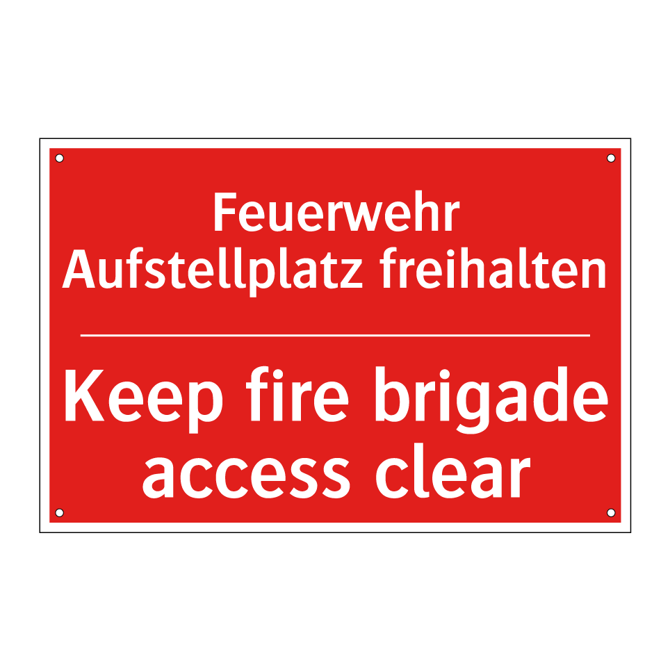 Zweisprachiges Brandschutzschild mit deutschem Text Feuerwehr Aufstellplatz freihalten und englischem Text Keep fire brigade access clear