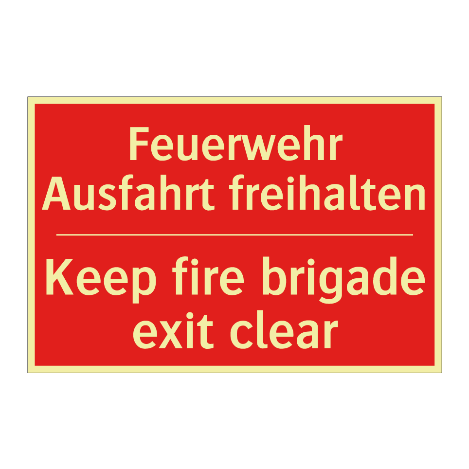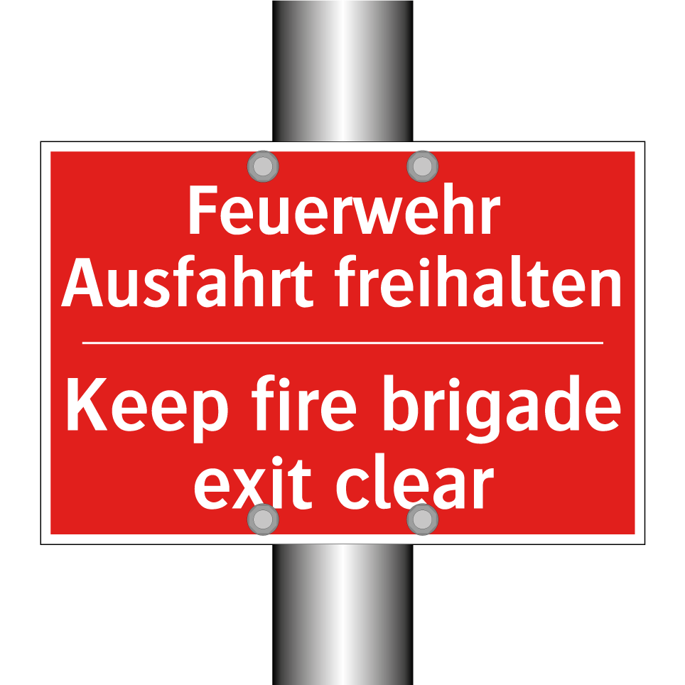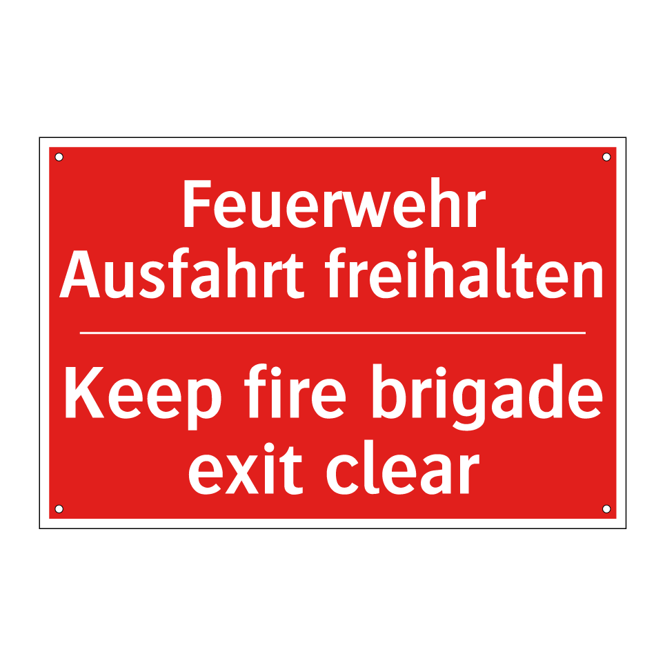 Zweisprachiges Brandschutzschild mit deutschem Text Feuerwehr Ausfahrt freihalten und englischem Text Keep fire brigade exit clear