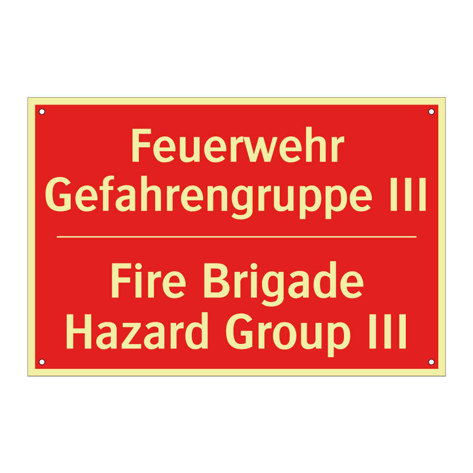 Zweisprachiges Brandschutzschild mit deutschem Text Feuerwehr Gefahrengruppe III und englischem Text Fire Brigade Hazard Group III