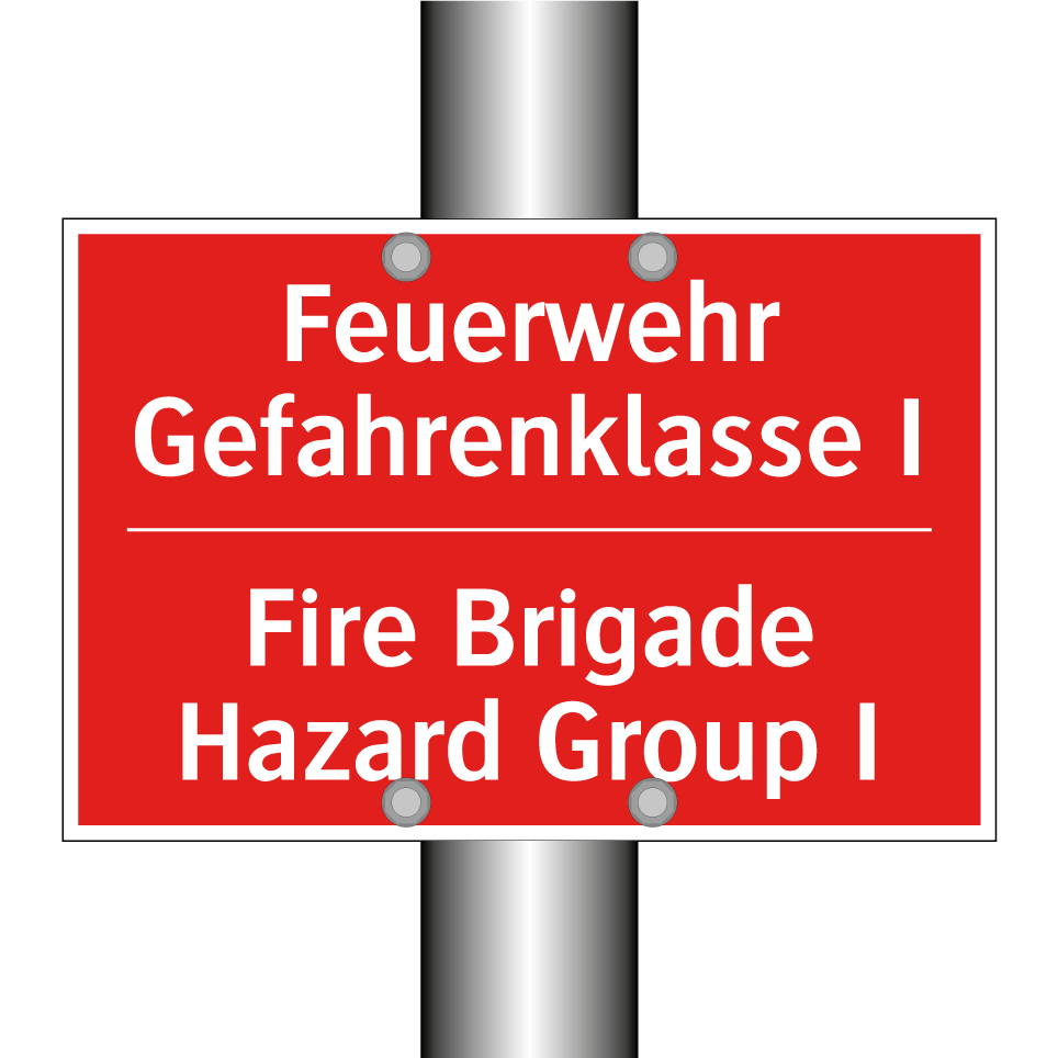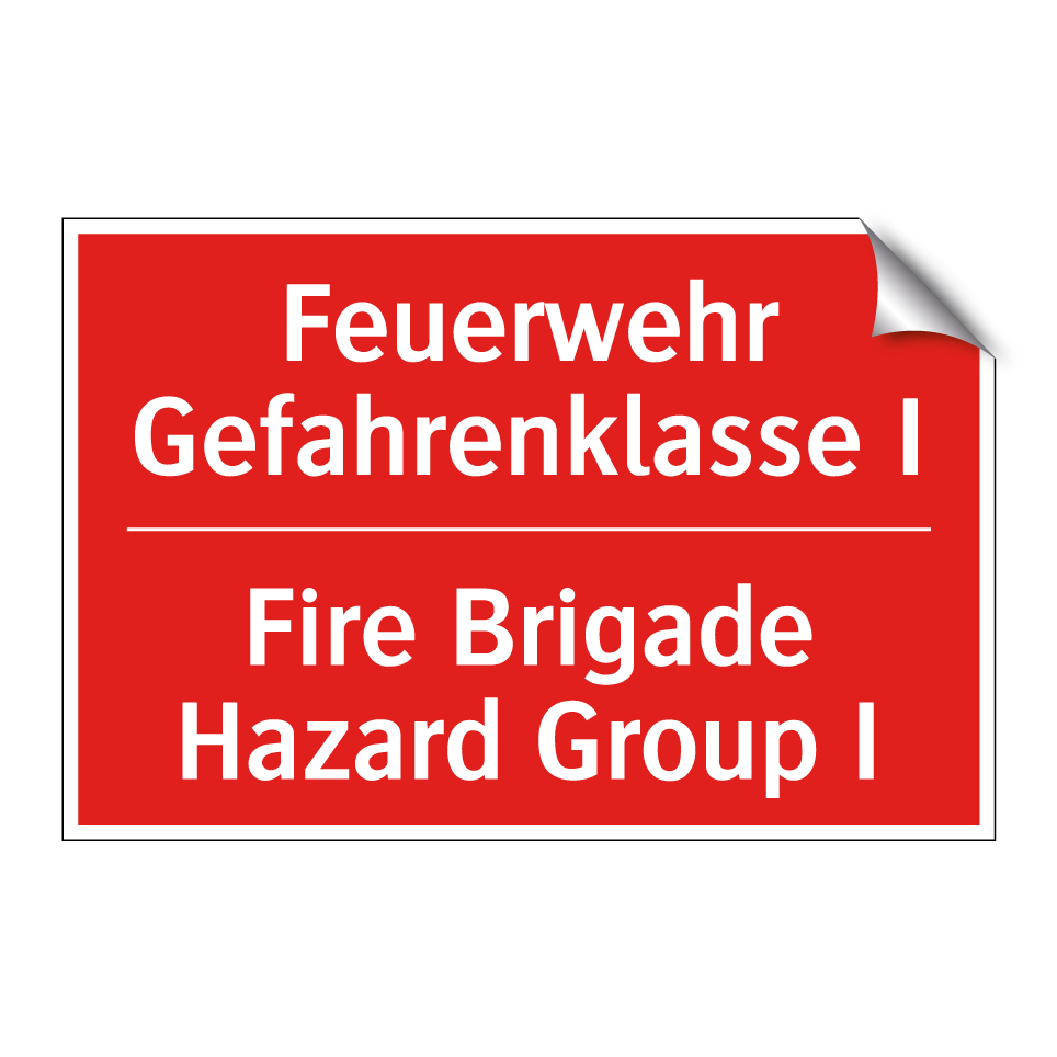 Zweisprachiges Brandschutzschild mit deutschem Text Feuerwehr Gefahrenklasse I und englischem Text Fire Brigade Hazard Group I