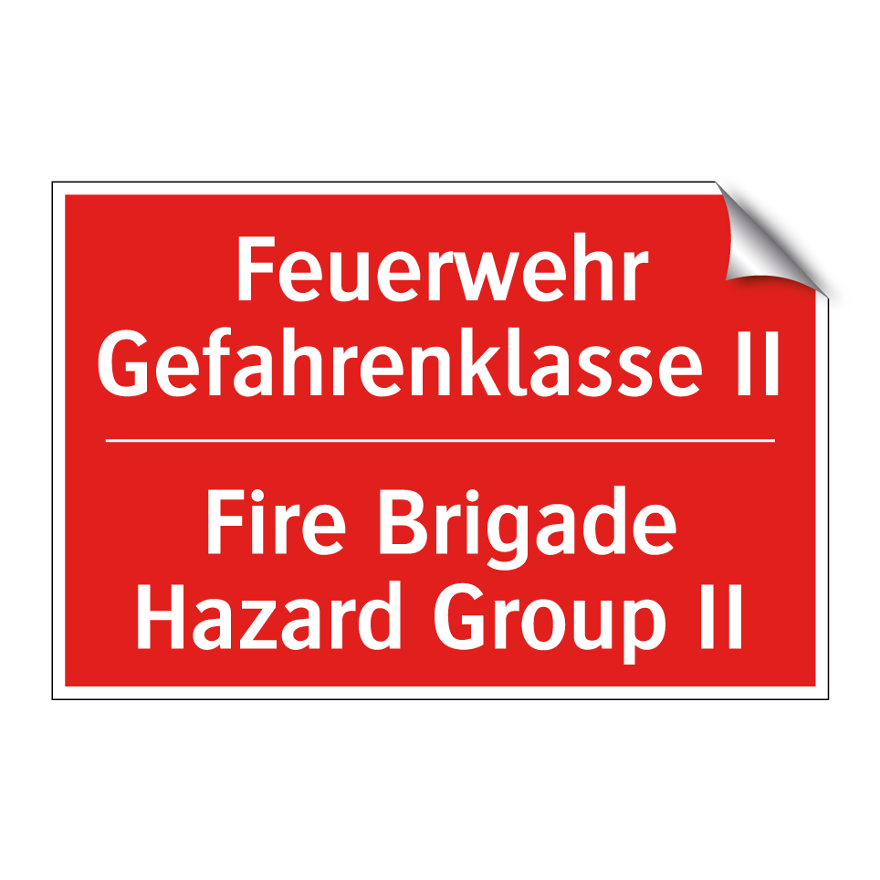 Zweisprachiges Brandschutzschild mit deutschem Text Feuerwehr Gefahrenklasse II und englischem Text Fire Brigade Hazard Group II