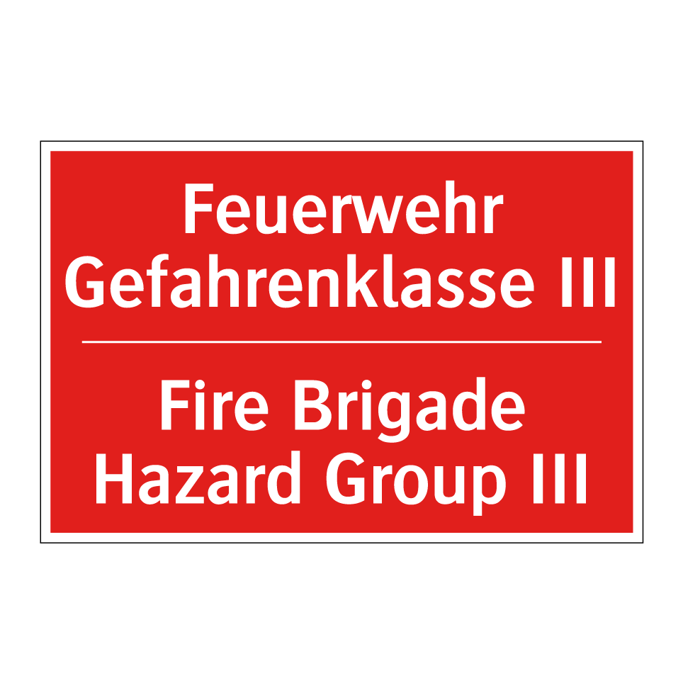Zweisprachiges Brandschutzschild mit deutschem Text Feuerwehr Gefahrenklasse III und englischem Text Fire Brigade Hazard Group III