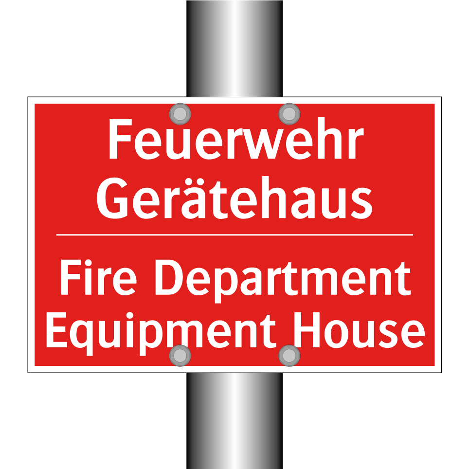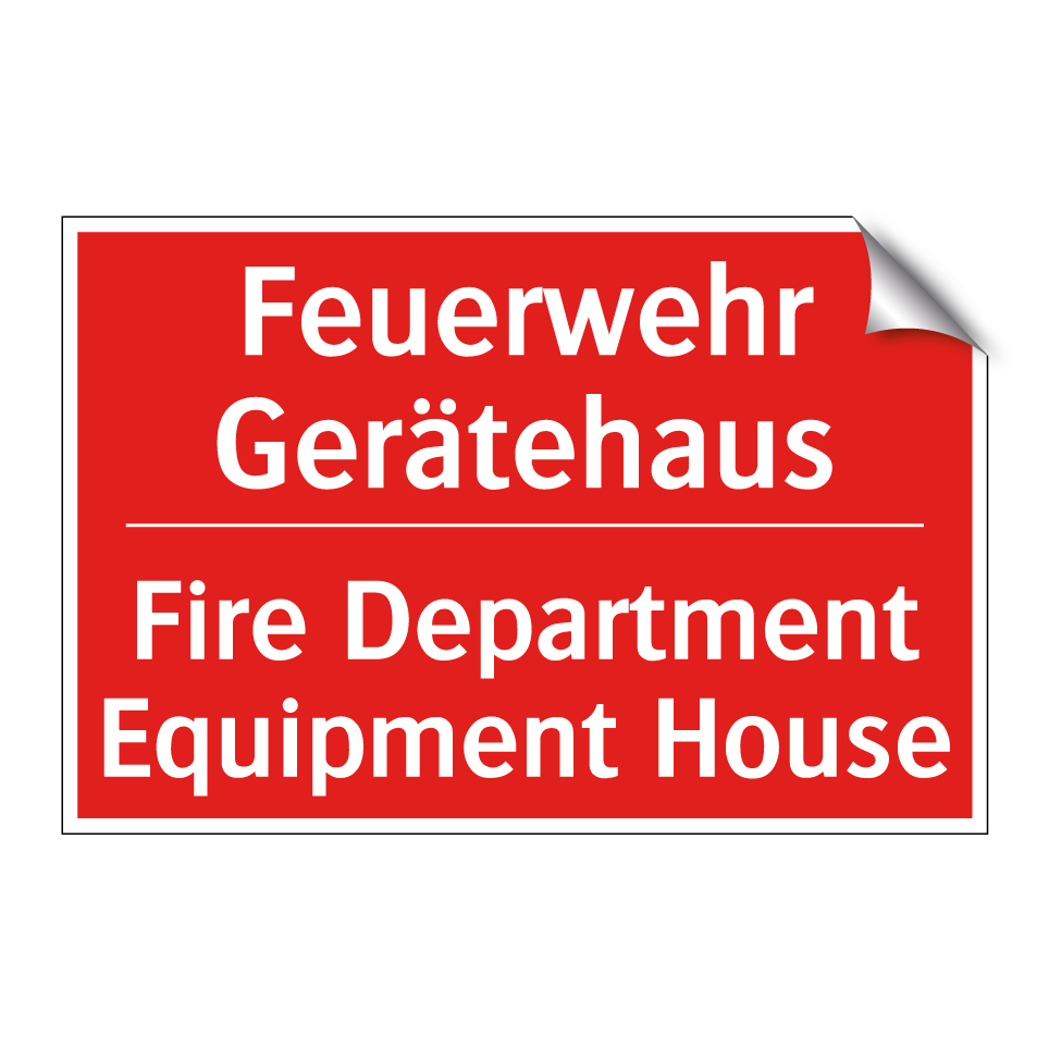 Zweisprachiges Brandschutzschild mit deutschem Text Feuerwehr Gerätehaus und englischem Text Fire Department Equipment House