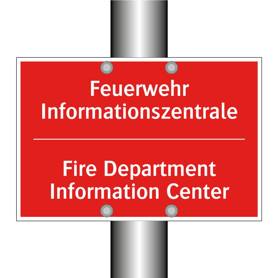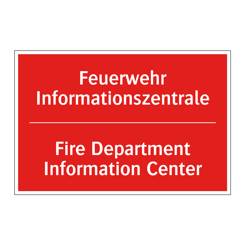 Zweisprachiges Brandschutzschild mit deutschem Text Feuerwehr Informationszentrale und englischem Text Fire Department Information Center